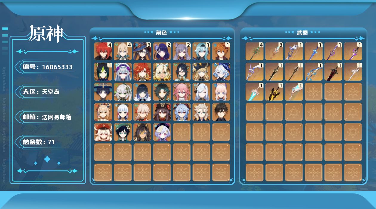 [16065333]60级/71黄/女主/32个五星角色/16个五星武器