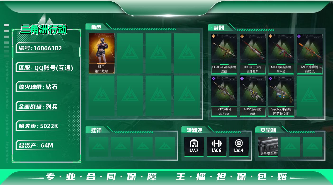 [16066182]64m总资产-5022k哈伏币-58烽火等级-钻石-15战场等级-列兵 【干员外观】:骇爪-维什戴尔 【近战皮肤】:近战-黑鹰 【传说外观】:M4A1突击步枪-阿米娅,SCAR-H战斗步枪-启航,R93狙击步枪-维什戴尔 【史诗外观】:MP5冲锋枪-战术竞备,MP5冲锋枪-竞技风,Vector冲锋枪-阿萨拉文明,M250通用机枪-囚徒 【稀有外观】:AKM突击步枪-肃杀,M7战斗步枪-捣蛋鬼,SCAR-H战斗步枪-荣耀列队,K437突击步枪-生存指令,MK47突击步枪-精英联盟,MP5冲锋枪-哈夫克卫队,SMG-45-行动开启,勇士冲锋枪-冰天雪地,QJB201轻机枪-哈夫克卫队,Mini-14射手步枪-荣耀列队,SR-25射手步枪-开拓,G18-星链科技,G18-哈夫克航天 【普通外观】:M4A1突击步枪-粉色涂装,QBZ95-1突击步枪-高雅黑,QBZ95-1突击步枪-海浪,K416突击步枪-几何迷彩,K416突击步枪-高雅黑,M16A4突击步枪-高雅黑,AUG突击步枪-浅蓝涂装,M7战斗步枪-红色涂装,SG552突击步枪-海浪,G3战斗步枪-高雅黑,MP5冲锋枪-海色,MP5冲锋枪-黄蜂,Vector冲锋枪-几何迷彩,UZI冲锋枪-海色,M1014霰弹枪-海浪,M250通用机枪-条纹,SR-25射手步枪-黄蜂,SV-98狙击步枪-红色涂装,QSZ92G-条纹,沙漠之鹰-海浪,沙漠之鹰-高雅黑 【载具外观】:轮式突击炮-荣耀 【军牌】:军牌-装备修理,军牌-静谧时光,军牌-来点薯条,军牌-修整,军牌-神秘艺术,军牌-信誉优秀,军牌-小心鳄鱼 【挂饰】:挂饰-维什戴尔,挂饰-蚀金玫瑰,挂饰-阿萨拉狙击兵,挂饰-阿萨拉霰弹兵,挂饰-诡影狙击兵,挂饰-诡影喷火兵*2,挂饰-崩岩重炮*2,挂饰-暗行哨兵,挂饰-启程,挂饰-阿萨拉徽章