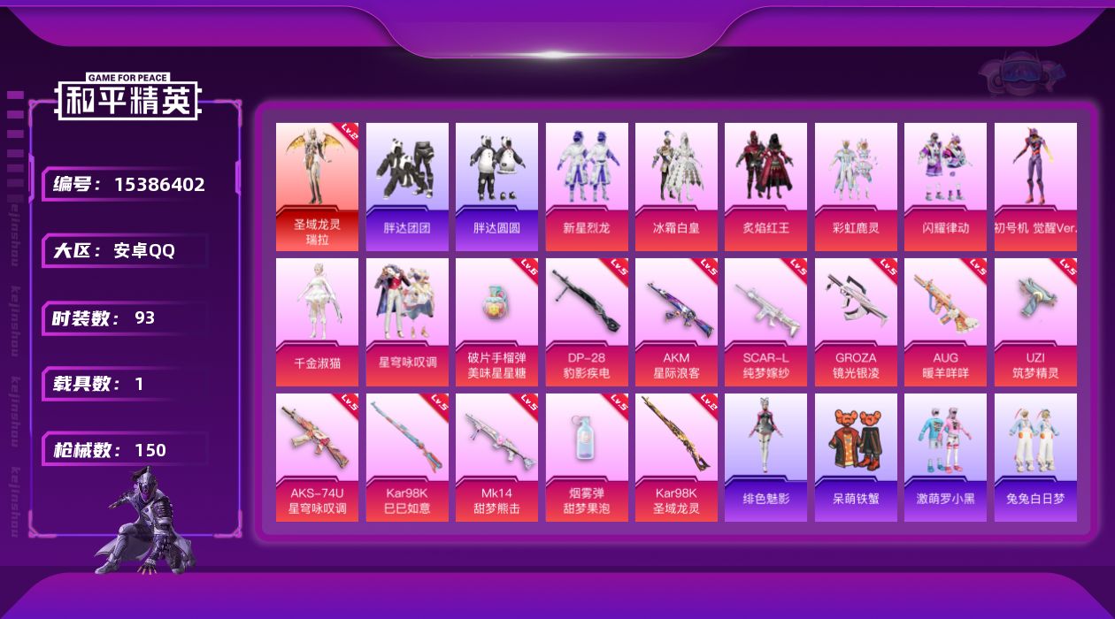 [15386402]【特价出售/店主推荐】安卓 手Q-1神装-8粉装-12特效枪-1载具-5粉色飞行器-51084热力值-12王牌印记-93套装-150枪皮【红色神装等级】:圣域龙灵-瑞拉(二级)【红色角色神装】:圣域龙灵-瑞拉【热门品类】:套装-胖达团团,套装-胖达圆圆,套装-粉红小猪,角色-8号机,角色-Mark.06【粉色套装】:粉装-新星烈龙,粉装-冰霜白皇,粉装-炙焰红王,粉装-彩虹鹿灵,粉装-闪耀律动,角色-初号机 觉醒Ver.,角色-千金淑猫,粉装-星穹咏叹调【粉色枪皮等级】:AKM-星际浪客(五级),SCAR-L-纯梦嫁纱(五级),GROZA-镜光银凌(五级),AUG-暖羊咩咩(五级),UZI-筑梦精灵(五级),AKS-74U-星穹咏叹调(五级),Kar98K-巳巳如意(五级),Kar98K-圣域龙灵(二级),Mk14-甜梦熊击(五级),DP-28-豹影疾电(五级),烟雾弹-甜梦果泡(五级),破片手榴弹-美味星星糖(六级)【粉色载具】:僚机-圣域【粉色枪皮】:AKM-星际浪客,SCAR-L-纯梦嫁纱,GROZA-镜光银凌,AUG-暖羊咩咩,UZI-筑梦精灵,AKS-74U-星穹咏叹调,Kar98K-巳巳如意,Kar98K-圣域龙灵,Mk14-甜梦熊击,DP-28-豹影疾电,烟雾弹-甜梦果泡,破片手榴弹-美味星星糖【粉色飞行器】:歌者泠鸢飞行器,英伦信使飞行器,圣域金龙飞行器