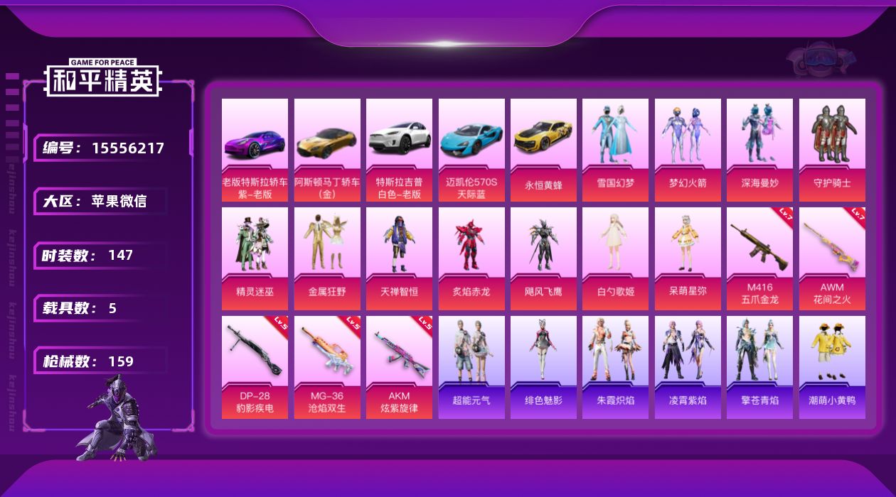 [15556217]【特价出售/店主推荐】苹果 微信-11粉装-5特效枪-5载具-5粉色飞行器-68936热力值-13王牌印记-147套装-159枪皮【热门品类】:粉装-雪国幻梦,粉装-梦幻火箭,套装-SS1特训,套装-潮萌小黄鸭,套装-浪漫波比【粉色套装】:粉装-深海曼妙,粉装-守护骑士,粉装-雪国幻梦,粉装-精灵迷巫,粉装-梦幻火箭,粉装-金属狂野,粉装-天禅智恒,粉装-炙焰赤龙,粉装-飓风飞鹰,角色-白勺歌姬,色-呆萌星弥【粉色枪皮等级】:AKM-炫紫旋律(五级),M416-五爪金龙(七级),AWM-花间之火(七级),DP-28-豹影疾电(五级),MG-36-沧焰双生(五级)【粉色载具】:特斯拉Model 3(奇幻紫),特斯拉Model X(珍珠白),阿斯顿马丁DBS(金),迈凯伦570S(天际蓝),永恒黄蜂【粉色枪皮】:AKM-炫紫旋律,M416-五爪金龙,AWM-花间之火,DP-28-豹影疾电,MG-36-沧焰双生【粉色飞行器】:春暖花开飞行器,梦幻火箭飞行器,伏魔团飞行器