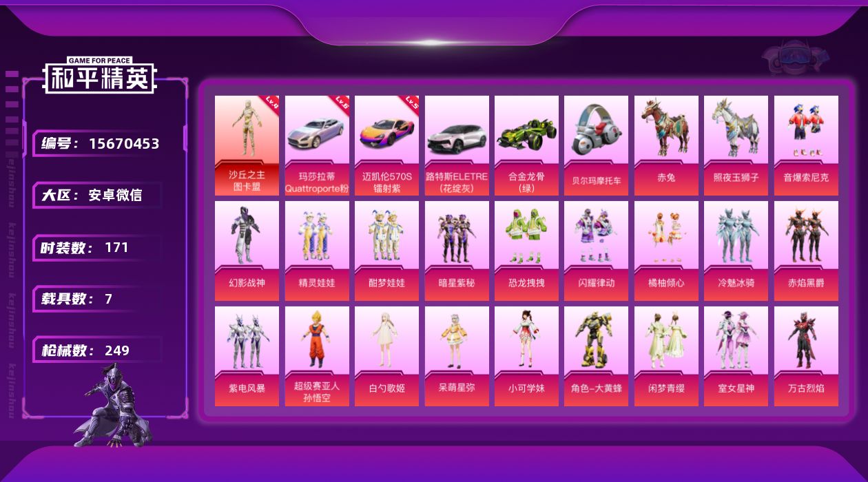[15670453]【特价出售/店主推荐】安卓 微信-1神装-25粉装-19特效枪-7载具-9粉色飞行器-117105热力值-15王牌印记-171套装-249枪皮【红色载具】:玛莎拉蒂Quattroporte(幻星粉)(六级),迈凯伦570S(镭射紫)(五级)【红色神装等级】:沙丘之主-图卡盟(四级)【红色角色神装】:沙丘之主-图卡盟【热门品类】:粉装-音爆索尼克,角色-军刀雅典娜,套装-忍者信条,角色-2B战斗服款,角色-2P战斗服款,角色-忠猛周仓,角色-忠真马岱,角色-忠义严颜,套装-六号树人,套装-龟仙人,套装-粉红小猪,大砍刀-青龙偃月刀,撬棍-龙胆亮银枪【粉色套装】:粉装-幻影战神,粉装-精灵娃娃,粉装-酣梦娃娃,粉装-暗星紫秘,粉装-恐龙拽拽,粉装-闪耀律动,粉装-橘柚倾心,粉装-冷魅冰骑,粉装-赤焰黑爵,粉装-紫电风暴,粉装-音爆索尼克,超级赛亚人-孙悟空,角色-白勺歌姬,角色-呆萌星弥,角色-小可学妹,角色-大黄蜂,粉装-闲梦青缨,粉装-室女星神,角色-万古烈焰,角色-宙之时溯,角色-星云暗核,粉装-莲影清波,角色-冰炎战车,角色-小叽联名款,粉装-星穹咏叹调【粉色枪皮等级】:AKM-百合蜜语(三级),AKM-熔岩统帅(三级),SCAR-L-青春物语(一级),SCAR-L-万古烈焰(九级),M416-风花雪月(五级),GROZA-焦糖拿铁(一级),GROZA-巴啦啦小魔仙(五级),AUG-甜心首席(三级),M762-甜心娃娃(一级),M762-冷魅冰骑(七级),UZI-绮梦青鸾(四级),UMP45-恐龙拽拽(五级),P90-能量风暴(四级),P90-沙丘之主(三级),Kar98K-未来歌姬(一级),Kar98K-巳巳如意(五级),M24-暗星紫秘(四级),AWM-橘柚倾心(四级),DP-28-豹影疾电(五级)【粉色载具】:路特斯ELETRE(花绽灰),玛莎拉蒂Quattroporte(幻星粉),迈凯伦570S(镭射紫),合金龙骨(绿),布尔玛摩托车,赤兔,照夜玉狮子【粉色枪皮】:AKM-百合蜜语,AKM-熔岩统帅,SCAR-L-青春物语,SCAR-L-万古烈焰,M416-风花雪月,GROZA-焦糖拿铁,GROZA-巴啦啦小魔仙,AUG-甜心首席,M762-甜心娃娃,M762-冷魅冰骑,UZI-绮梦青鸾,UMP45-恐龙拽拽,P90-能量风暴,P90-沙丘之主,Kar