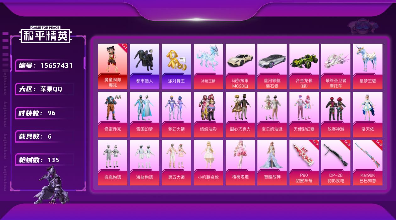 [15657431]苹果 手Q-1神装-15粉装-7特效枪-6载具-8粉色飞行器-56335热力值-8王牌印记-96套装-135枪皮【红色神装等级】:魔童闹海-哪吒(一级)【红色角色神装】:魔童闹海-哪吒【热门品类】:粉装-怪诞乔克,粉装-雪国幻梦,粉装-梦幻火箭,粉装-缤纷油彩,套装-浪漫天命,套装-都市猎人,套装-派对舞王,套装-潮萌小黄鸭,套装-糯粉咩咩,套装-软软马卡龙【粉色套装】:粉装-怪诞乔克,粉装-甜心巧克力,粉装-宝贝奶油派,粉装-天使彩虹糖,粉装-雪国幻梦,粉装-梦幻火箭,粉装-缤纷油彩,粉装-放客神游,角色-洛天依,粉装-岚岚物语,粉装-海盐物语,粉装-第五大道,角色-小叽联名款,角色-樱桃泡泡,角色-智耀战神【粉色枪皮等级】:AKM-炫紫旋律(四级),Vector-最终圣卫者(三级),P90-甜蜜草莓(七级),Kar98K-巳巳如意(五级),AWM-天使羽翼(四级),DP-28-千金淑猫(二级),DP-28-豹影疾电(五级)【粉色载具】:玛莎拉蒂MC20(星石白),星河领航(磐石银),合金龙骨(绿),最终圣卫者摩托车,空客H135-蔚蓝之翼,僚机-冰龙团团,星梦玉骢,冰绡玉鳞【粉色枪皮】:AKM-炫紫旋律,Vector-最终圣卫者,P90-甜蜜草莓,Kar98K-巳巳如意,AWM-天使羽翼,DP-28-千金淑猫,DP-28-豹影疾电【粉色飞行器】:时空协奏飞行器,绯果甜心飞行器,雀灵庇佑飞行器,终晖之翼飞行器,飞天猪飞行器,灵珠游龙飞行器