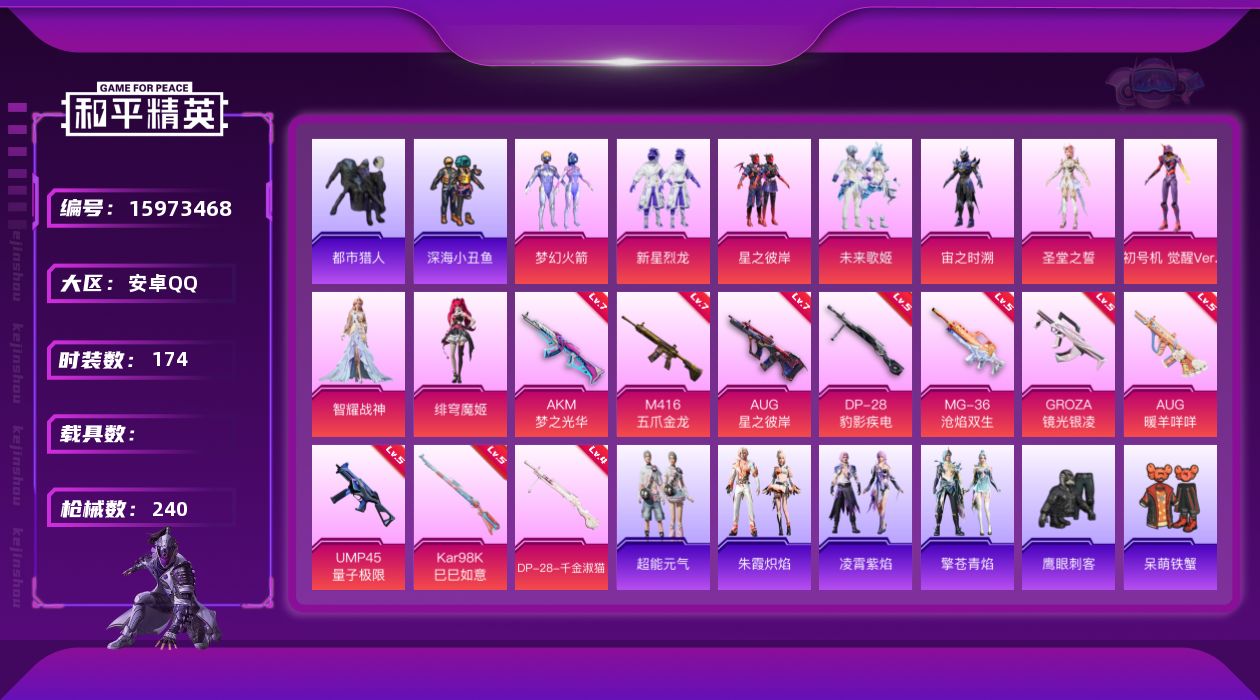 [15973468]【特价出售/店主推荐】安卓 手Q-9粉装-10特效枪-0载具-3粉色飞行器-77955热力值-15王牌印记-174套装-240枪皮【热门品类】:粉装-梦幻火箭,套装-浪漫天命,套装-都市猎人,套装-深海小丑鱼,套装-小丑鱼,套装-龟仙人,套装-暗影哥特,角色-8号机,角色-Mark.06【粉色套装】:粉装-梦幻火箭,粉装-新星烈龙,粉装-星之彼岸,粉装-未来歌姬,角色-宙之时溯,角色-圣堂之誓,角色-初号机 觉醒Ver.,角色-智耀战神,角色-绯穹魔姬【粉色枪皮等级】:AKM-梦之光华(七级),M416-五爪金龙(七级),GROZA-镜光银凌(五级),AUG-星之彼岸(七级),AUG-暖羊咩咩(五级),UMP45-量子极限(五级),Kar98K-巳巳如意(五级),DP-28-千金淑猫(四级),DP-28-豹影疾电(五级),MG-36-沧焰双生(五级)【粉色枪皮】:AKM-梦之光华,M416-五爪金龙,GROZA-镜光银凌,AUG-星之彼岸,AUG-暖羊咩咩,UMP45-量子极限,Kar98K-巳巳如意,DP-28-千金淑猫,DP-28-豹影疾电,MG-36-沧焰双【粉色飞行器】:梦幻火箭飞行器,极意拳锋飞行器