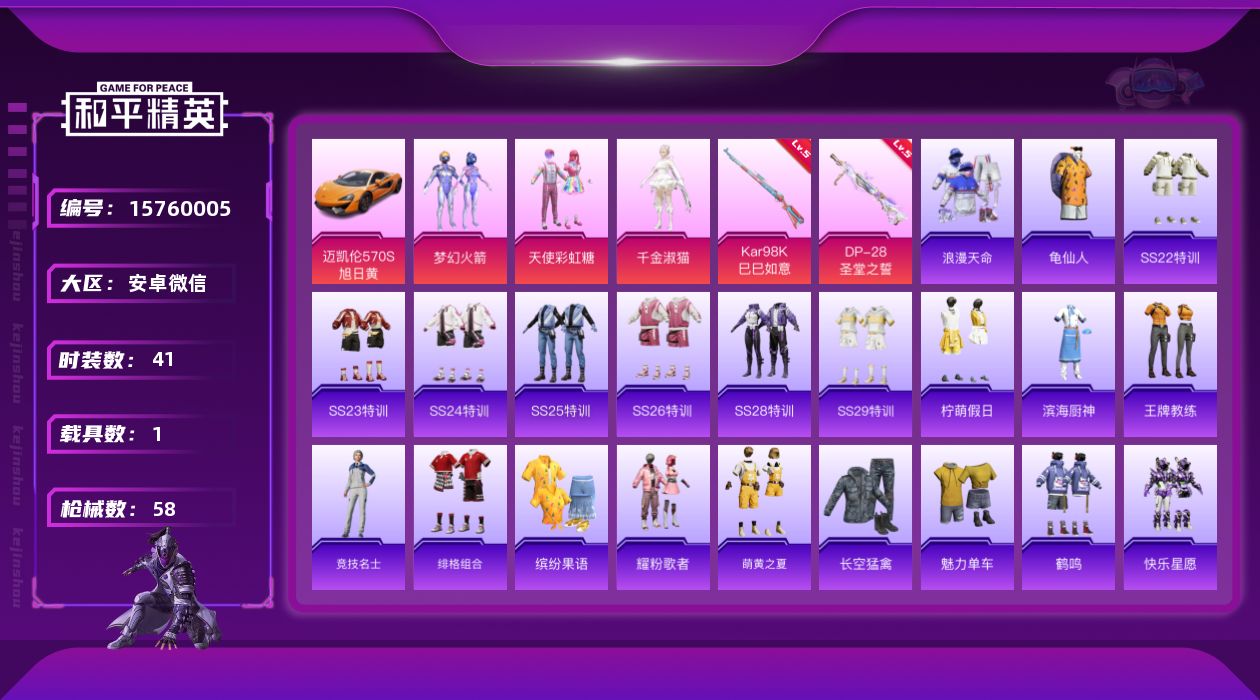 [15760005]【特价出售/店主推荐】安卓 微信-3粉装-2特效枪-1载具-1粉色飞行器-17562热力值-3王牌印记-41套装-58枪皮【热门品类】:粉装-梦幻火箭,套装-浪漫天命,套装-龟仙人【粉色套装】:粉装-天使彩虹糖,粉装-梦幻火箭,角色-千金淑猫【粉色枪皮等级】:Kar98K-巳巳如意(五级),DP-28-圣堂之誓(五级)【粉色载具】:迈凯伦570S(旭日黄)【粉色枪皮】:Kar98K-巳巳如意,DP-28-圣堂之誓【粉色飞行器】:月下星之子飞行器
