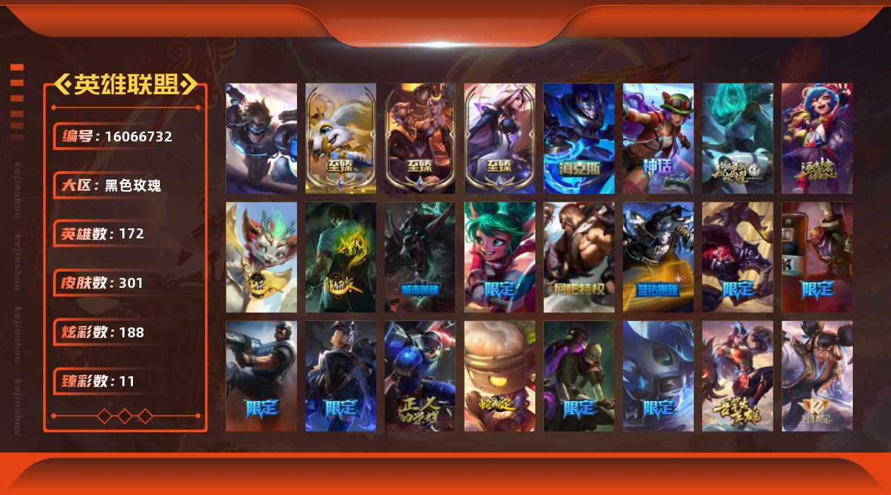 铂金段位-172英雄-301皮肤-188炫彩-1终极-7神话-48限定-33传说-60史诗