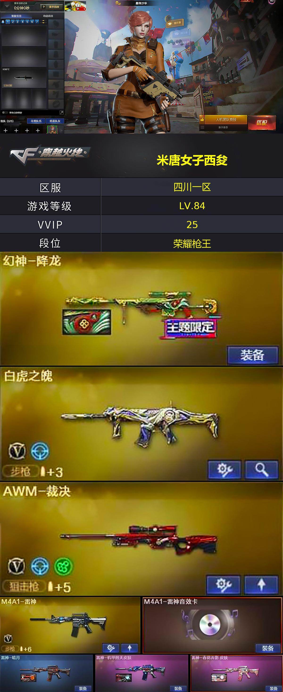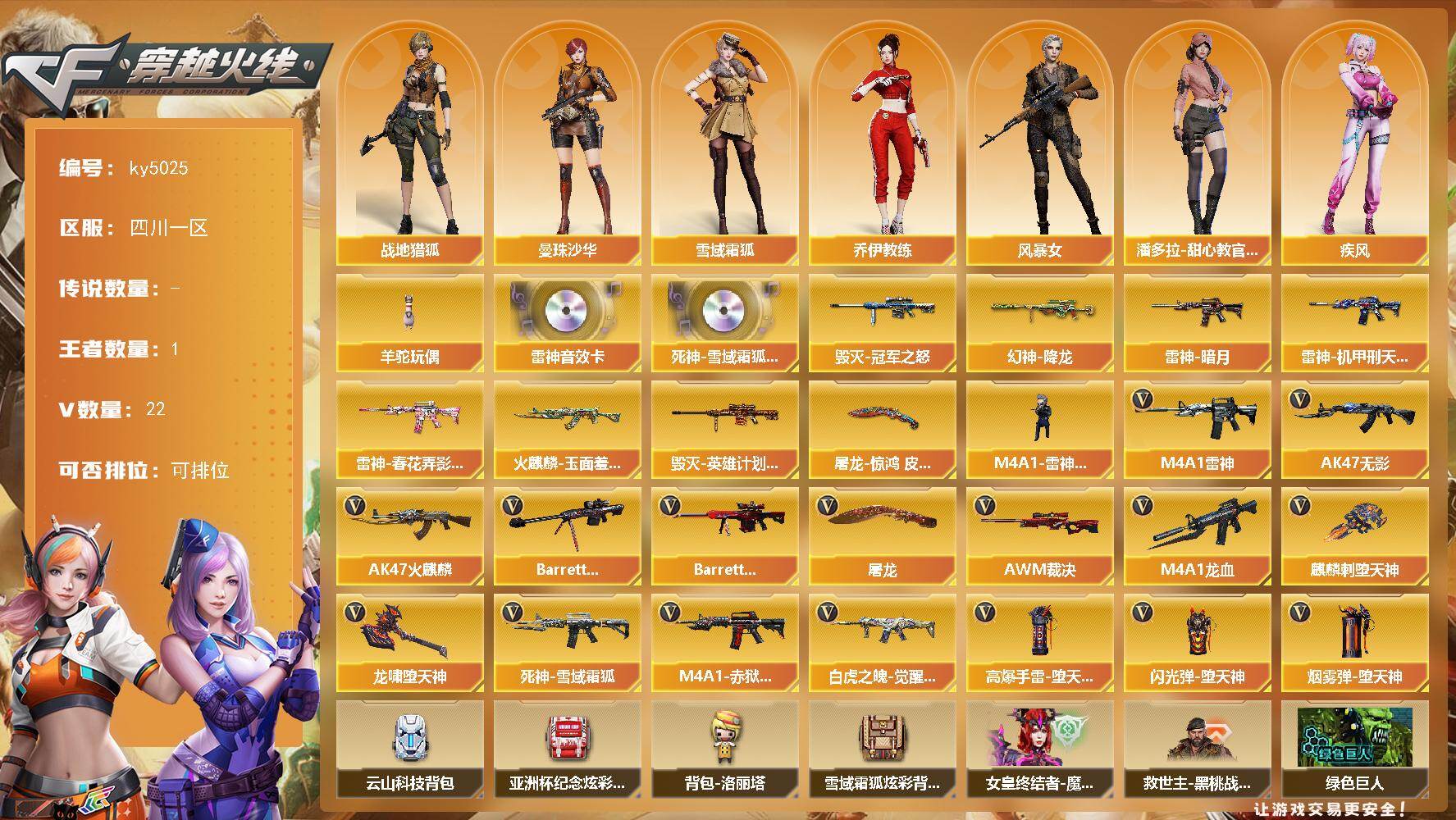 [16067229]四川一区-22V-1王者-0炫金 【热门武器】:羊驼玩偶 【音效卡】:M4A1-雷神音效卡,死神-雪域霜狐-怀旧音效卡 【皮肤】:幻神-降龙,雷神-暗月,雷神-机甲刑天皮肤,雷神-春花弄影 皮肤,火麒麟-玉面羞花 皮肤,毁灭-冠军之怒,毁灭-英雄计划 皮肤,屠龙-惊鸿 皮肤 【角色】:曼珠沙华,战地猎狐,雪域霜狐,乔伊教练,风暴女,疾风,潘多拉-甜心教官 【人偶武器】:M4A1-雷神-精英刀锋 【英雄级武器】:AK47-火麒麟,M4A1-雷神,AK47-无影,M4A1-龙血,死神-雪域霜狐,白虎之魄-觉醒版,Barrett-毁灭,Barrett-极光,AWM-裁决,屠龙*2,麒麟刺-堕天神,龙啸-堕天神,高爆手雷-堕天神*2,闪光弹-堕天神*2,烟雾弹-堕天神*2,M4A1-赤狱骑士 【道具】:云山科技背包,亚洲杯纪念炫彩背包,背包-洛丽塔,雪域霜狐炫彩背包,女皇终结者-魔龙之吻,救世主-黑桃战神,黄金生化钩,绿色巨人,灵魂忍者,迷雾幽灵,夺命之镰,防化服*3,金色流光-枪王排位,枪王排位28赛季金色流光,语音特效-怀旧,语音特效-热带奇洋,雪域霜狐表情,CFPL选手表情-第1套,防弹头盔*4,防弹衣*4,C4工具钳*4,手雷包*4 【特殊枪械】: