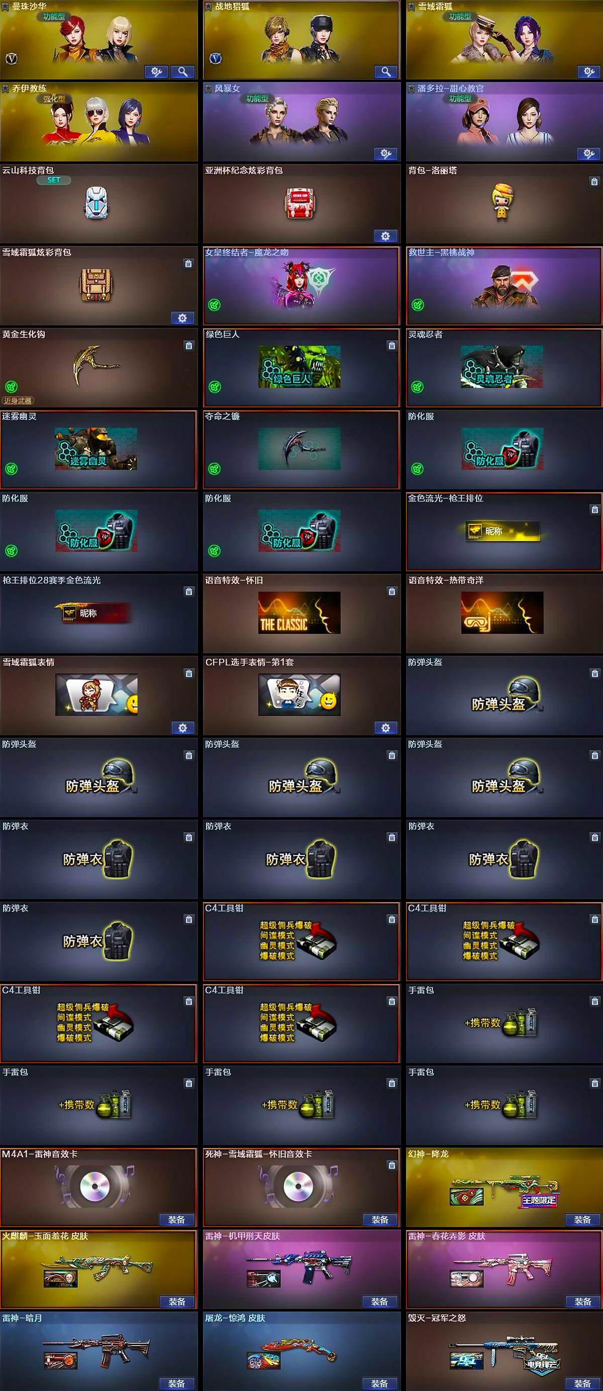 【道具】:云山科技背包,亚洲杯纪念炫彩背包,背包-洛丽塔,雪域霜狐炫彩背包,女皇终结者-魔龙之吻,救世主-黑桃战神,黄金生化钩,绿色巨人,灵魂忍者,迷雾幽灵,夺命之镰,防化服*3,金色流光-枪王排位,枪王排位28赛季金色流光,语音特效-怀旧,语音特效-热带奇洋,雪域霜狐表情,CFPL选手表情-第1套,防弹头盔*4,防弹衣*4,C4工具钳*4,手雷包*4