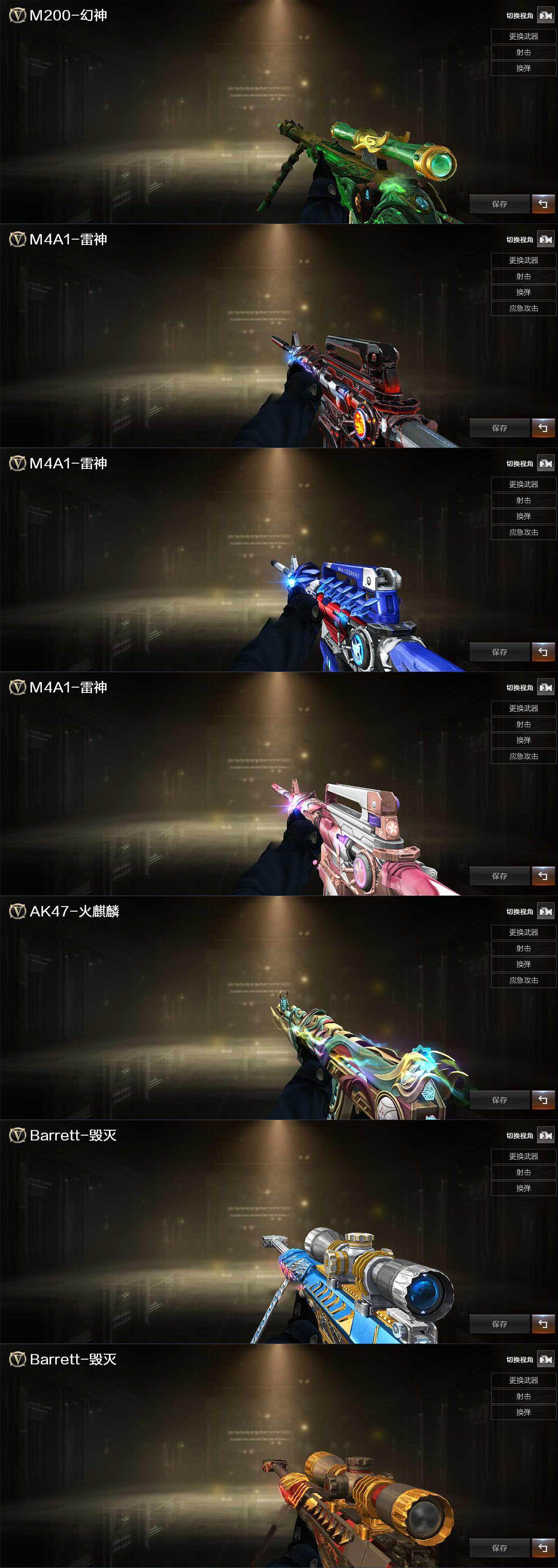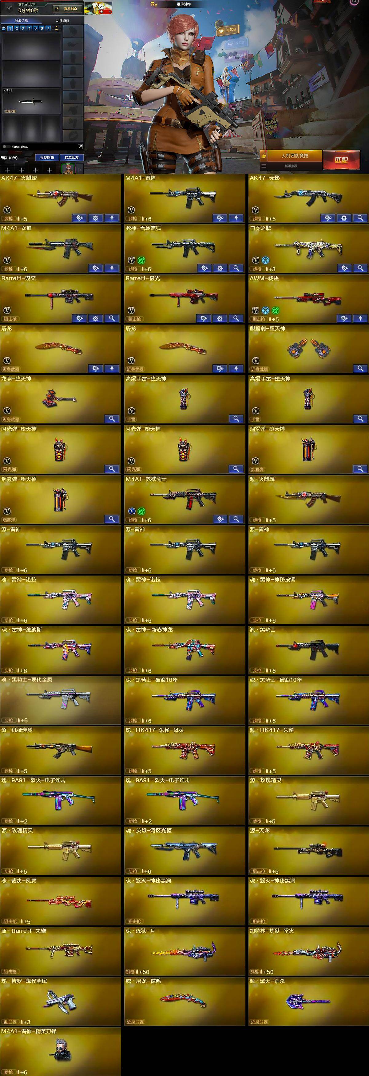 【英雄级武器】:AK47-火麒麟,M4A1-雷神,AK47-无影,M4A1-龙血,死神-雪域霜狐,白虎之魄-觉醒版,Barrett-毁灭,Barrett-极光,AWM-裁决,屠龙*2,麒麟刺-堕天神,龙啸-堕天神,高爆手雷-堕天神*2,闪光弹-堕天神*2,烟雾弹-堕天神*2,M4A1-赤狱骑士