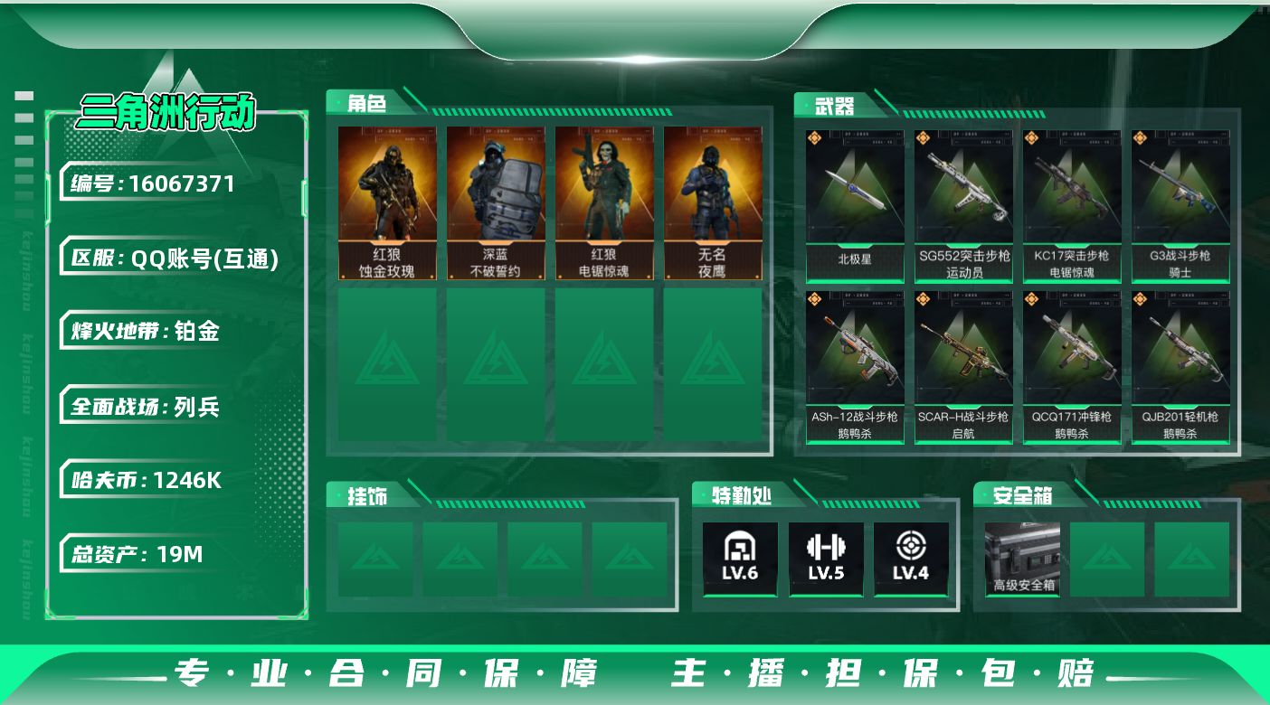 [16067371]19m总资产-1246k哈伏币-60烽火等级-铂金-11战场等级-列兵 【干员外观】:红狼-蚀金玫瑰,无名-夜鹰,深蓝-不破誓约,红狼-电锯惊魂 【近战皮肤】:近战-北极星,近战-黑鹰 【传说外观】:M4A1突击步枪-蚀金玫瑰,M4A1突击步枪-阿米娅,ASh-12战斗步枪-鹅鸭杀,SG552突击步枪-运动员,AK-12突击步枪-夜鹰,AK-12突击步枪-特斯拉线圈,SCAR-H战斗步枪-启航,G3战斗步枪-骑士,CAR-15突击步枪-黑鹰坠落,K437突击步枪-北极星,KC17突击步枪-电锯惊魂,Vector冲锋枪-能天使-午夜邮差,UZI冲锋枪-特斯拉线圈,SMG-45冲锋枪-骑士,SR-3M紧凑突击步枪-特斯拉线圈,勇士冲锋枪-能天使-午夜邮差,QCQ171冲锋枪-北极星,QCQ171冲锋枪-鹅鸭杀,M250通用机枪-骑士之心,QJB201轻机枪-鹅鸭杀,M14射手步枪-电锯惊魂 【史诗外观】:AKM突击步枪-林中猎手,ASh-12战斗步枪-守夜人,ASh-12战斗步枪-无极限,AUG突击步枪-蝮蛇,SG552突击步枪-尖端治疗,SG552突击步枪-深海恐惧,SCAR-H战斗步枪-囚徒,AS Val突击步枪-尖端治疗,AS Val突击步枪-百步穿杨,腾龙突击步枪-猎鳄行动,K437突击步枪-守护者,MP5冲锋枪-深海恐惧,MP5冲锋枪-战术竞备,Vector冲锋枪-阿萨拉文明,Vector冲锋枪-异域战争,SR-3M紧凑突击步枪-战术竞备,勇士冲锋枪-工业狂潮,MP7冲锋枪-守护者,M1014霰弹枪-林中猎手,S12K霰弹枪-曙光,PKM通用机枪-蝮蛇,PKM通用机枪-守夜人,M250通用机枪-囚徒,Mini-14射手步枪-守护者,SVD狙击步枪-阿萨拉工艺,M14射手步枪-黑鹰坠落,SR-25射手步枪-尖端治疗,SR-25射手步枪-聚光灯,SV-98狙击步枪-囚徒,M700狙击步枪-守夜人,AWM狙击步枪-无极限,.357左轮-幸运时刻,复合弓-守护者 【稀有外观】:PKM通用机枪-极地勘察队,AKM突击步枪-战术演练,QBZ95-1突击步枪-公平竞技,K416突击步枪-黑骑士,M16A4突击步枪-远航,M7战斗步枪-捣蛋鬼,SCAR-H战斗步枪-童趣,SCAR-H战斗步枪-远航,SCAR-H战斗步枪-荣耀列队,SCAR-H战斗步枪-黄昏,G3战斗步枪-战