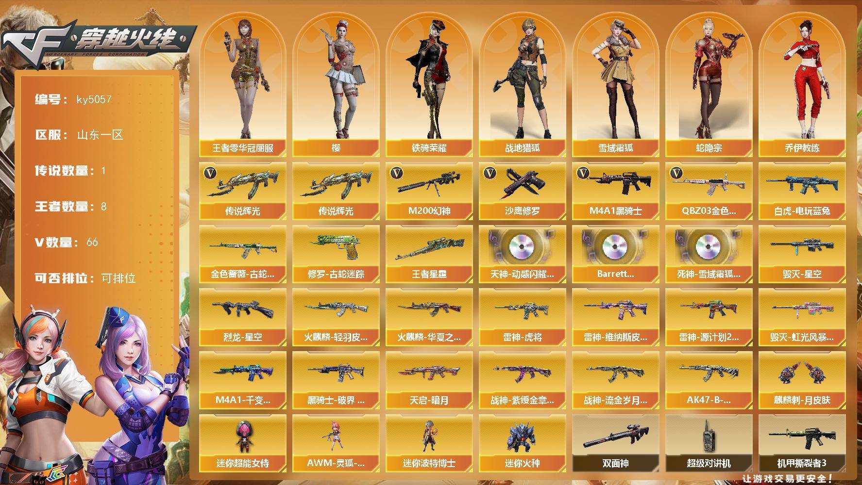 [16067472]山东一区-66V-8王者-0炫金 【传说武器】:传说辉光 【热门武器】:传说辉光,QBZ03-金色蔷薇,M200-幻神*2,金色蔷薇-古蛇迷踪,修罗-古蛇迷踪,白虎-电玩蓝兔,M4A1-黑骑士*3,沙鹰-修罗*2 【王者炫金武器】:王者星霆 【音效卡】:天神-动感闪耀 音效卡,Barrett-碧霄极光音效卡,死神-雪域霜狐-怀旧音效卡 【皮肤】:烈龙-星空,雷神-虎将,雷神-维纳斯皮肤,雷神-源计划2.0专属 皮肤,火麒麟-华夏之心,火麒麟-轻羽皮肤,毁灭-星空,毁灭-虹光风暴 皮肤,M4A1-千变-孔明皮肤,黑骑士-破界 皮肤,天启-暗月,战神-紫绶金章皮肤,战神-流金岁月皮肤,AK47-B-常胜将军-刘备,麒麟刺-月皮肤 【角色】:樱,战地猎狐,王者零-华冠丽服,雪域霜狐,蛇隐宗,奇洋探员,乔伊教练,修道士,暗夜-X,初恋灵狐,风暴女,嘉年华灵狐,灵狐者-X,龙儿-小淘气,潘多拉-X,蛇姬,斯沃特-X,铁骑荣耀,新娜塔莎,雪莉杨-摸金校尉 【人偶武器】:AWM-灵狐-15周年嘉年华,迷你波特博士*2,迷你火种*2,迷你超能女侍 【暴走生化】:双面神,超级对讲机 【挑战大师】:激光毁灭者III-白马银枪,激光毁灭者III*2,机甲撕裂者III,试炼破坏者III,神圣爆裂者-末日III 【英雄级武器】:AK47-火麒麟,M4A1-黑龙,M4A1-雷神,M4A1-黑骑士*3,AK47-无影,AK47-机械迷城,无影-神兵利器,黑武士-锦绣游龙,金色蔷薇-古蛇迷踪,死神-雪域霜狐,QBZ03-金色蔷薇,烈火-动感闪耀,王者之武-觉醒版,AK-47-猩红传说*3,AK47-B-常胜将军,白虎-电玩蓝兔,Barrett-毁灭,M200-幻神*2,沙鹰-修罗*2,沙鹰-天神*5,天神-动感闪耀,修罗-古蛇迷踪,屠龙*2,龙啸,擎天*3,麒麟刺,擎天-竞技荣光,屠龙-动感闪耀,雷霆王者之锋-觉醒版,高爆手雷-竞技荣光*7,手雷-动感闪耀,手雷-热带奇洋,高爆手雷-古蛇迷踪,闪光弹-竞技荣光*7,闪光弹-雷霆王者-觉醒版*2,烟雾弹-竞技荣光*7,烟雾弹-古蛇迷踪,M4A1-赤狱骑士 【道具】:BS战队炫彩背包,亚洲杯纪念炫彩背包,古蛇迷踪炫彩背包,奇洋探员-海龟背包,炫彩背包,背包-洛丽塔,超级背包,雪域霜狐炫彩背包,黄金曼提柯尔的背包,救世主-黑桃战神,绿色巨人,灵魂忍者,