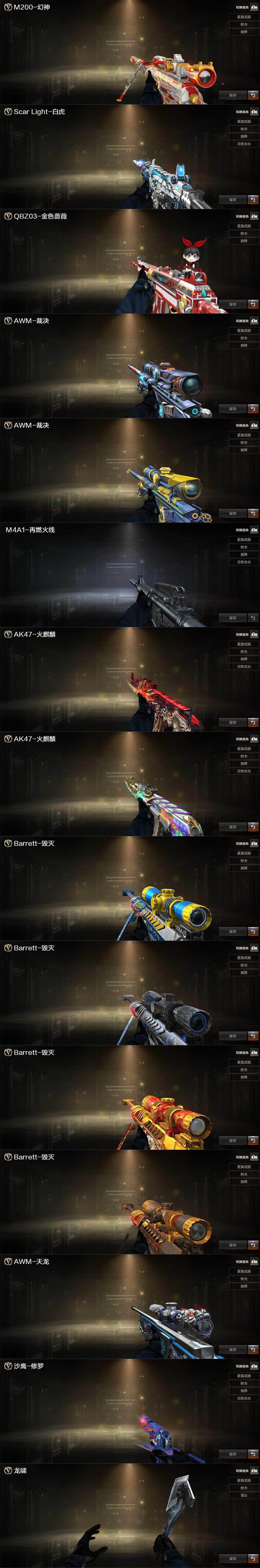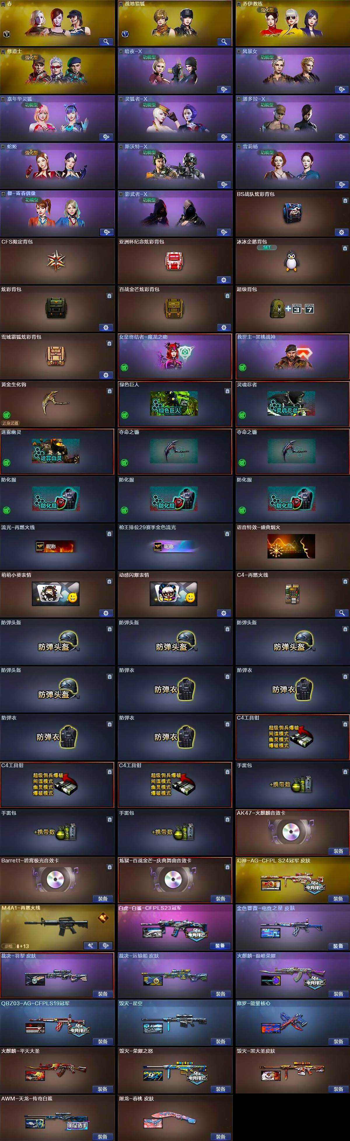 【皮肤】:幻神-AG-CFPL S24冠军 皮肤,白虎-白鲨-CFPLS23冠军,QBZ03-AG-CFPLS19冠军,金色蔷薇-电竞之星 皮肤,裁决-羽掣 皮肤,裁决-运输船 皮肤,M4A1-再燃火线,火麒麟-平天大圣,火麒麟-巅峰荣耀,毁灭-荣耀之怒,毁灭-星空,毁灭-黑大圣皮肤,毁灭-英雄计划 皮肤,AWM-天龙-传奇白鲨,修罗-能量核心,屠龙-春桃 皮肤,轻型军用手斧-再燃火线