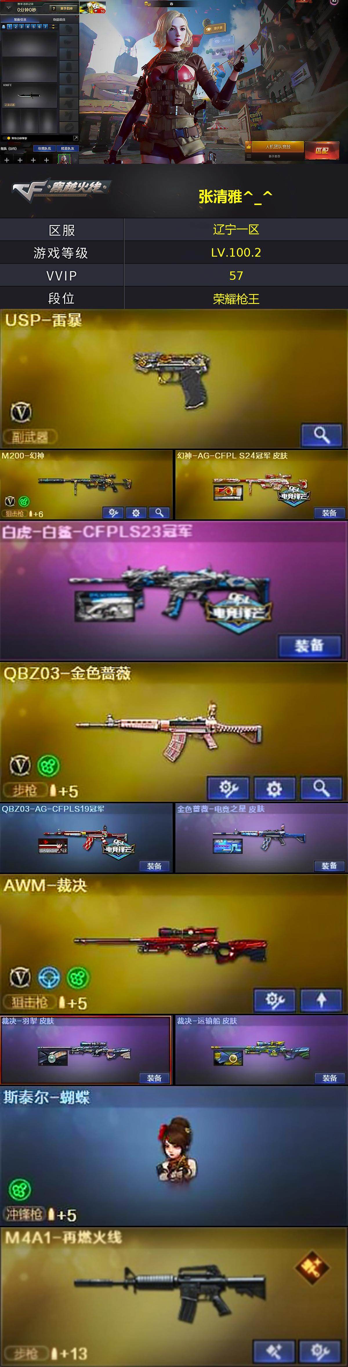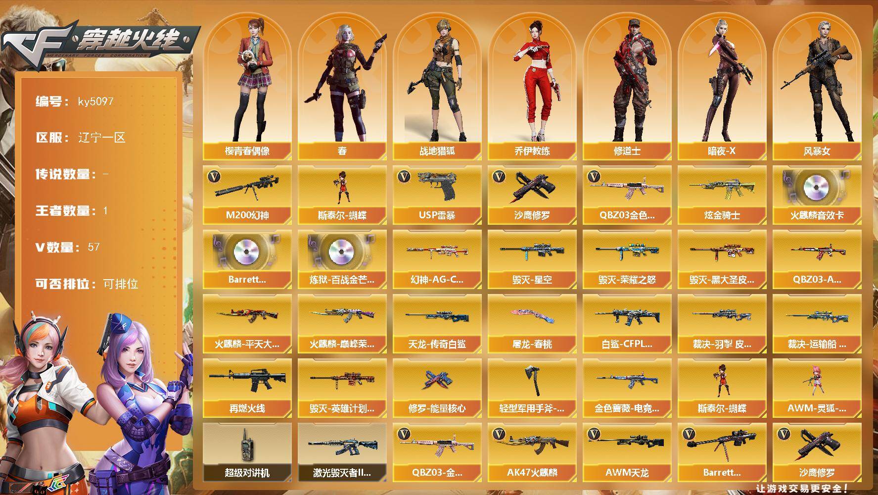 [16067841]辽宁一区-57V-1王者-1炫金 【热门武器】:QBZ03-金色蔷薇,M200-幻神,斯泰尔-蝴蝶,USP-雷暴,沙鹰-修罗 【王者炫金武器】:炫金骑士 【音效卡】:AK47-火麒麟音效卡,Barrett-碧霄极光音效卡,炼狱-百战金芒-庆典舞曲音效卡 【皮肤】:幻神-AG-CFPL S24冠军 皮肤,白虎-白鲨-CFPLS23冠军,QBZ03-AG-CFPLS19冠军,金色蔷薇-电竞之星 皮肤,裁决-羽掣 皮肤,裁决-运输船 皮肤,M4A1-再燃火线,火麒麟-平天大圣,火麒麟-巅峰荣耀,毁灭-荣耀之怒,毁灭-星空,毁灭-黑大圣皮肤,毁灭-英雄计划 皮肤,AWM-天龙-传奇白鲨,修罗-能量核心,屠龙-春桃 皮肤,轻型军用手斧-再燃火线 【角色】:春,战地猎狐,乔伊教练,修道士,暗夜-X,风暴女,嘉年华灵狐,灵狐者-X,潘多拉-X,蛇姬,斯沃特-X,雪莉杨,樱-青春偶像,影武者-X 【人偶武器】:斯泰尔-蝴蝶,AWM-灵狐-15周年嘉年华 【暴走生化】:超级对讲机 【挑战大师】:激光毁灭者III-白马银枪 【英雄级武器】:AK47-火麒麟,AK47-雷暴,无影-神兵利器,黑武士-锦绣游龙,QBZ03-金色蔷薇,王者之心-觉醒版,黑骑士-海王,AWM-天龙,Barrett-毁灭*2,AWM-裁决,M200-幻神,Barrett-朱雀,炼狱-百战金芒,沙鹰-修罗,沙鹰-天神*2,USP-雷暴,天神-动感闪耀,屠龙,斩神刀-雷暴,麒麟刺-百战金芒,高爆手雷-雷暴*7,手雷-动感闪耀,闪光弹-雷暴*7,烟雾弹-雷暴*7,M4A1-赤狱骑士 【道具】:BS战队炫彩背包,CFS限定背包,亚洲杯纪念炫彩背包,冰冰企鹅背包,炫彩背包,百战金芒炫彩背包,超级背包,雪域霜狐炫彩背包,女皇终结者-魔龙之吻,救世主-黑桃战神,黄金生化钩,绿色巨人,灵魂忍者,迷雾幽灵,夺命之镰*2,防化服*3,流光-再燃火线,枪王排位29赛季金色流光,语音特效-盛典烟火,萌萌小葵表情,动感闪耀表情,C4-再燃火线,防弹头盔*4,防弹衣*4,C4工具钳*3,手雷包*3 【特殊枪械】:蝴蝶斯泰尔+0烈龙,1蝴蝶斯泰尔