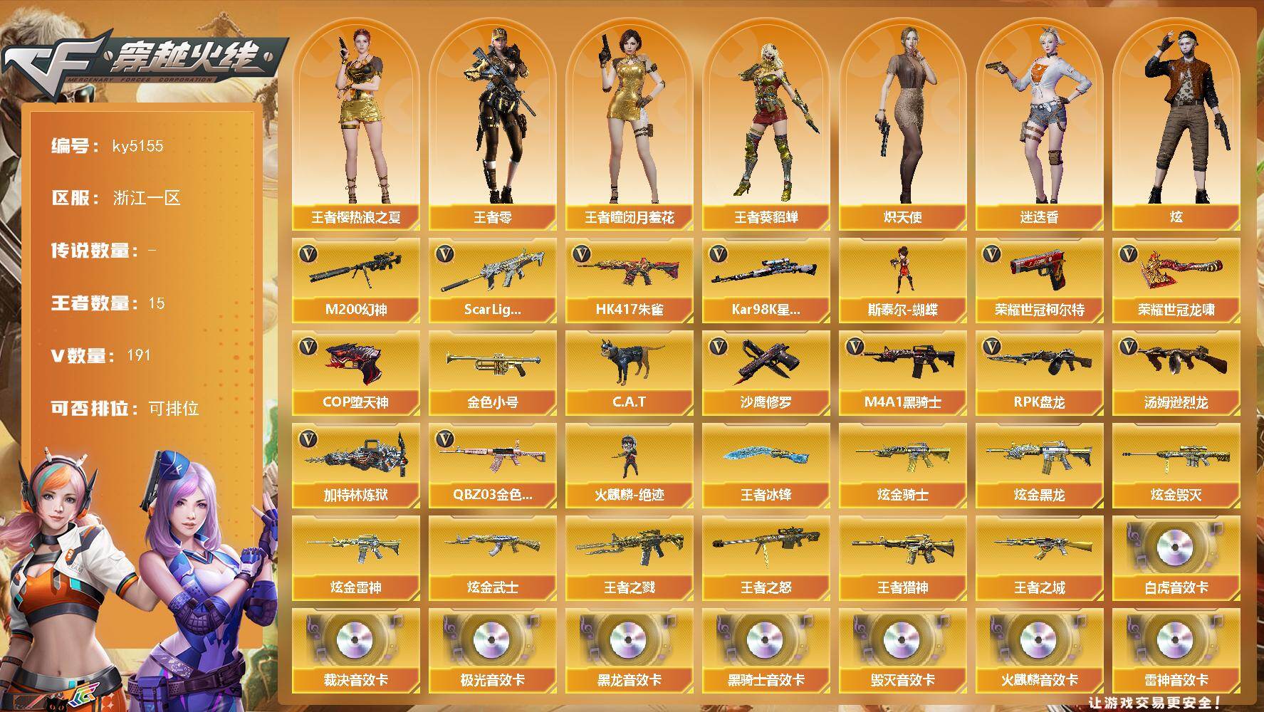 [16068216]浙江一区-191V-15王者-5炫金 【传说角色】:传说星骇 【热门武器】:QBZ03-金色蔷薇*2,Scar Light-白虎,HK417-朱雀,M200-幻神,荣耀世冠-柯尔特,Kar98K-星神,金色小号,C.A.T,M4A1-黑骑士*3,汤姆逊-烈龙*5,RPK-盘龙*7,加特林-炼狱*3,斯泰尔-蝴蝶,火麒麟-绝迹,COP-堕天神*2,沙鹰-修罗*5,荣耀世冠-龙啸 【王者炫金武器】:王者之城,王者之戮,王者猎神,王者之怒,王者冰锋,炫金骑士,炫金黑龙,炫金雷神,炫金武士,炫金毁灭 【音效卡】:AK47-火麒麟音效卡,M4A1-雷神音效卡,M4A1-黑龙音效卡,M4A1-黑骑士音效卡,Barrett-毁灭音效卡,Barrett-极光音效卡,AWM-裁决音效卡,Scar Light-白虎音效卡,白虎-盛典舞曲音效卡,炼狱-百战金芒-庆典舞曲音效卡 【皮肤】:M200-幻神-荣耀世冠白鲨,M200-幻神-N9-2022MVP,白虎-电玩粉兔皮肤,白虎-白鲨-CFPLS23冠军,白虎-百战金芒 皮肤,QBZ03-荣耀世冠白鲨,裁决-运输船 皮肤,烈龙-星空,雷神-能量核心,雷神-荣耀之魄,雷神-星空*2,雷神-虎将,雷神-耀金皮肤,M4A1-再燃火线,火麒麟-轻羽皮肤,火麒麟-平天大圣,火麒麟-心动糖果,毁灭-星空*2,毁灭-CFS2020,毁灭-秦师 皮肤,M4A1-千变-孔明皮肤,黑龙-能量核心,黑龙-暗月,黑骑士-暗月,无影-暗月,死神-秘银*2,AK47-黑武士-361,天启-暗月*2,战神-粉色甜心皮肤*4,战神-紫绶金章皮肤*10,战神-流金岁月皮肤*3,AK47-B-常胜将军-曹操*2,AK47-B-常胜将军-孙权*3,天龙-能量核心,AWM-天龙-传奇70KG,AWM-天龙-传奇白鲨,极光-能量核心,修罗-能量核心*2,修罗-星空*2,修罗-冠军之魂,天神-暗月,屠龙-荣耀之锋,屠龙-星火燎原,屠龙-惊鸿 皮肤,龙啸-冠军之啸,轻型军用手斧-再燃火线 【角色】:零,葵,瞳,魅影,炫,迷迭香,荒漠琉璃,审判者,王者-瞳-闭月羞花,王者樱-热浪之夏,王者-葵-貂蝉,王者-零,王者玲珑-小乔,奇洋探员,乔伊教练,炽天使,暗夜-X,飞虎队-X,风暴女,虎妞,嘉年华灵狐,兰妹妹,猎狐者-追月,灵狐者-黄金海岸,灵狐者-职业经理,龙儿,潘多拉-X,潜龙队-