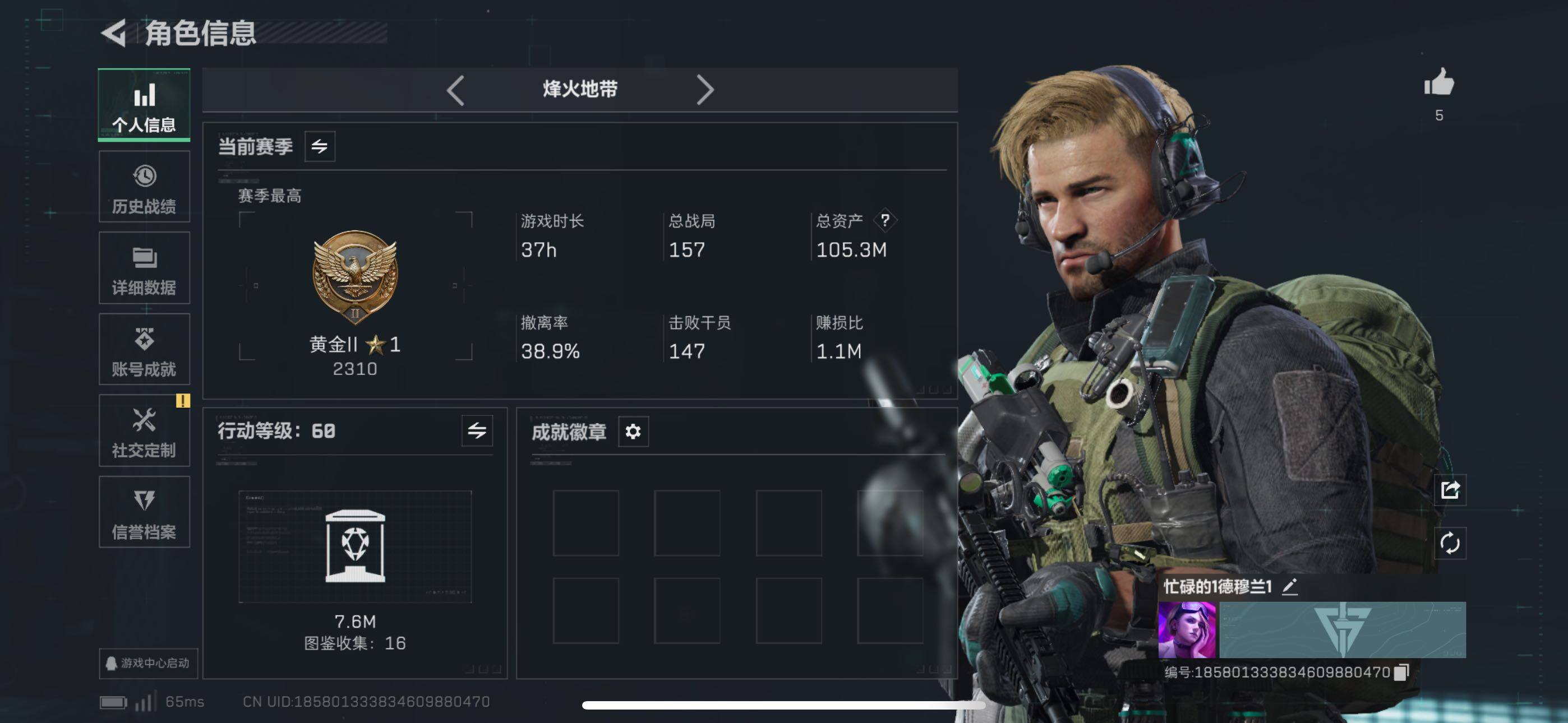 [16068733]【店主推荐捡漏号!可直接换绑】105m总资产-844k哈伏币-60烽火等级-黄金-18战场等级-军士长