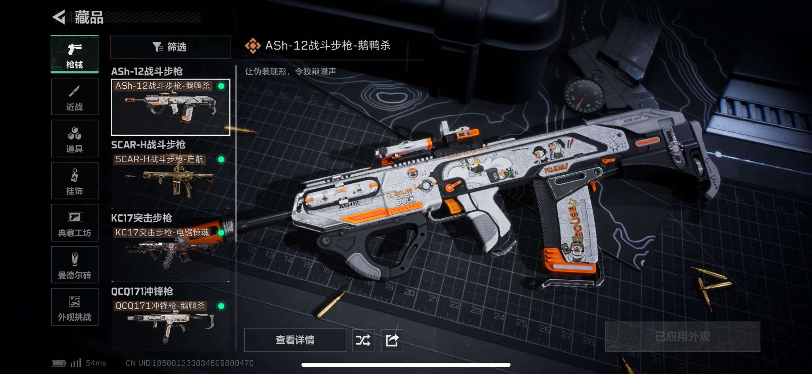 【传说外观】:ASh-12战斗步枪-鹅鸭杀,SCAR-H战斗步枪-启航,KC17突击步枪-电锯惊魂,QCQ171冲锋枪-鹅鸭杀,QJB201轻机枪-鹅鸭杀,R93狙击步枪-维什戴尔