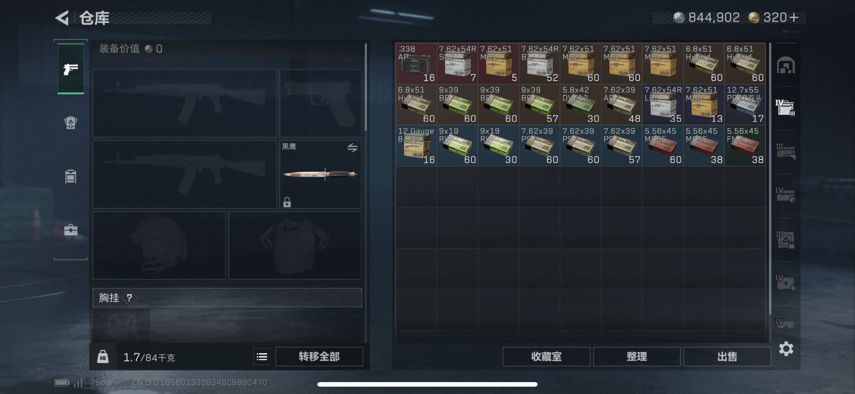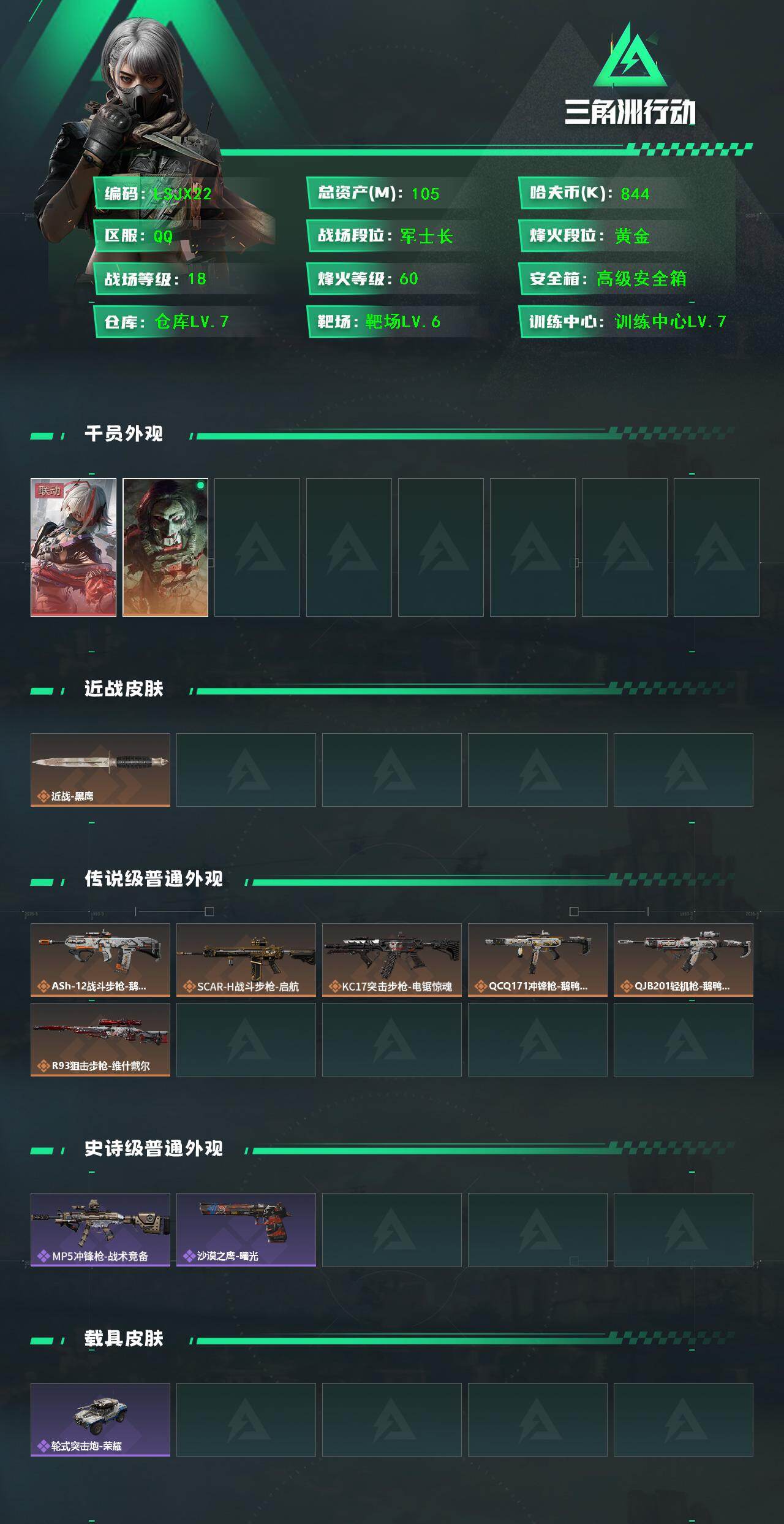 - [16216834]41m总资产-601k哈伏币-60烽火等级-钻石-37战场等级-上等兵 【干员外观】:红狼-蚀金玫瑰,露娜-黑·天际线,蜂医-送葬人·无题密令,深蓝-不破誓约,露娜-金牌射手 【近战皮肤】:近战-北极星,近战-黑鹰 【传说外观】:M4A1突击步枪-蚀金玫瑰,M4A1突击步枪-阿米娅,SG552突击步枪-运动员,AK-12突击步枪-特斯拉线圈,SCAR-H战斗步枪-启航,G3战斗步枪-骑士,CAR-15突击步枪-阿米娅,腾龙突击步枪-捞点薯条,K437突击步枪-北极星,UZI冲锋枪-特斯拉线圈,SR-3M紧凑突击步枪-特斯拉线圈,勇士冲锋枪-能天使-午夜邮差,QCQ171冲锋枪-北极星,725双管霰弹枪-送葬人-无题密令,M250通用机枪-骑士之心,杠杆式步枪-纵横,AWM狙击步枪-捞点薯条,93R-捞点薯条,复合弓-黑·天际线 【史诗外观】:AKM突击步枪-林中猎手,ASh-12战斗步枪-无极限,M16A4突击步枪-竞赛选手,AUG突击步枪-蝮蛇,M7战斗步枪-百步穿杨,SG552突击步枪-深海恐惧,SCAR-H战斗步枪-囚徒,G3战斗步枪-流沙送葬,AS Val突击步枪-百步穿杨,腾龙突击步枪-无垢,K437突击步枪-守护者,MP5冲锋枪-深海恐惧,MP5冲锋枪-战术竞备,MP5冲锋枪-竞技风,P90冲锋枪-莫斯提马,Vector冲锋枪-阿萨拉文明,Vector冲锋枪-百步穿杨,SR-3M紧凑突击步枪-荒野求生,SR-3M紧凑突击步枪-战术竞备,勇士冲锋枪-工业狂潮,MP7冲锋枪-无垢,MP7冲锋枪-守护者,M1014霰弹枪-林中猎手,PKM通用机枪-蝮蛇,PKM通用机枪-荒野求生,M250通用机枪-囚徒,Mini-14射手步枪-守护者,SVD狙击步枪-荒野求生,PSG-1射手步枪-无垢,SV-98狙击步枪-林中猎手,SV-98狙击步枪-囚徒,M700狙击步枪-蝮蛇,M700狙击步枪-百步穿杨,AWM狙击步枪-无极限,AWM狙击步枪-流沙送葬,沙漠之鹰-曙光,复合弓-守护者 【稀有外观】:M4A1突击步枪-战术小队,M4A1突击步枪-零点,M4A1突击步枪-前沿科技,M4A1突击步枪-繁盛,AKM突击步枪-战术演练,AKM突击步枪-肃杀,QBZ95-1突击步枪-精准打击,QBZ95-1突击步枪-公平竞技,ASh-12战斗步枪-星链科技,ASh-12战斗步枪-哈夫