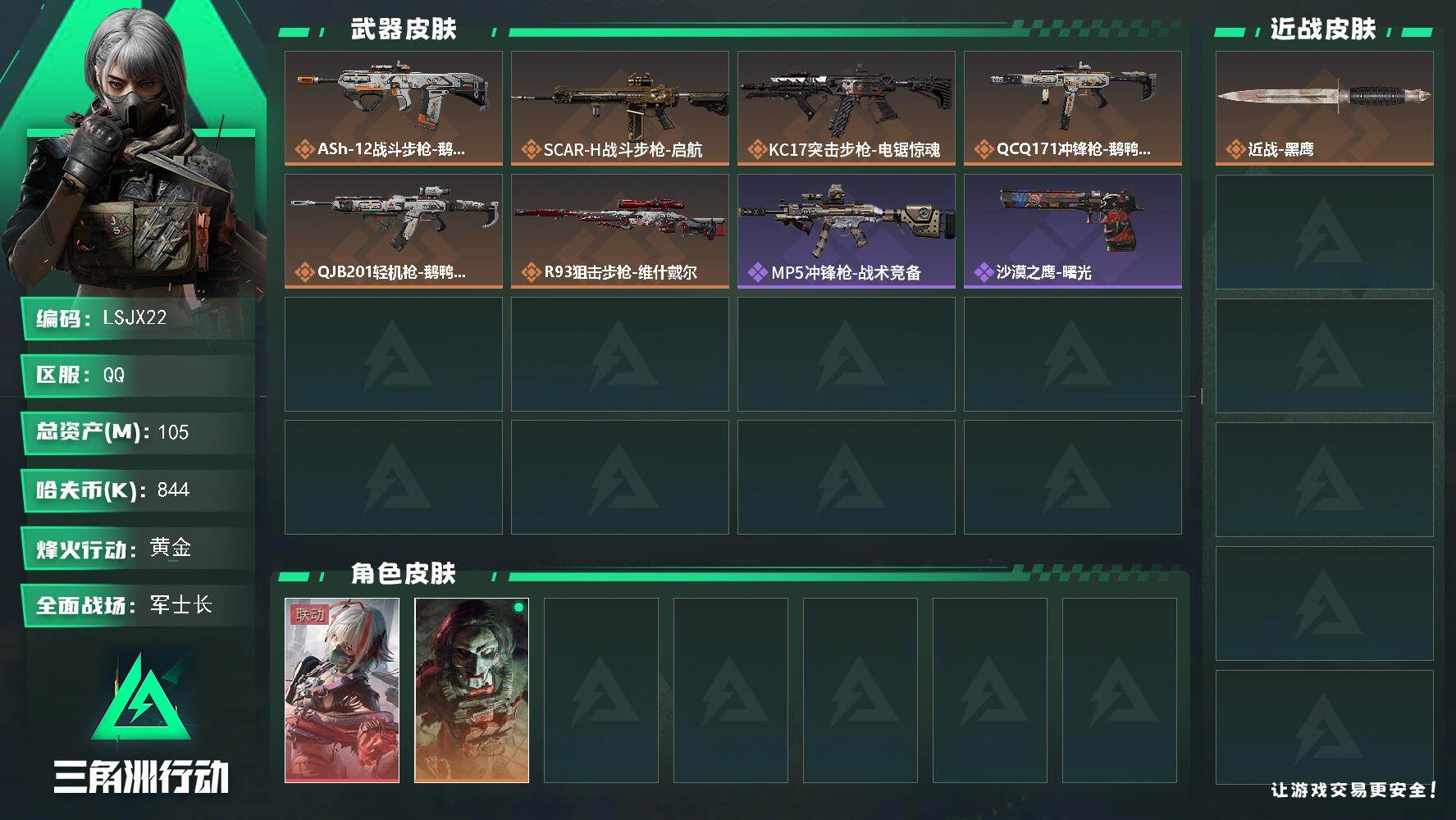 [16068733]【店主推荐捡漏号!可直接换绑】105m总资产-844k哈伏币-60烽火等级-黄金-18战场等级-军士长 【干员外观】:骇爪-维什戴尔,红狼-电锯惊魂 【近战皮肤】:近战-黑鹰 【传说外观】:ASh-12战斗步枪-鹅鸭杀,SCAR-H战斗步枪-启航,KC17突击步枪-电锯惊魂,QCQ171冲锋枪-鹅鸭杀,QJB201轻机枪-鹅鸭杀,R93狙击步枪-维什戴尔 【史诗外观】:MP5冲锋枪-战术竞备,沙漠之鹰-曙光 【稀有外观】:M1014霰弹枪-花岗岩,M4A1突击步枪-零点,AKM突击步枪-肃杀,QBZ95-1突击步枪-公平竞技,K416突击步枪-碳纤维,M7战斗步枪-捣蛋鬼,AK-12突击步枪-零点,SCAR-H战斗步枪-荣耀列队,腾龙突击步枪-冰天雪地,MP5冲锋枪-哈夫克卫队,P90冲锋枪-黄昏,P90冲锋枪-捣蛋鬼,Vector冲锋枪-先锋,UZI冲锋枪-亚特兰蒂斯,野牛冲锋枪-前沿科技,SMG-45-行动开启,勇士冲锋枪-冰天雪地,QJB201轻机枪-哈夫克卫队,SVD狙击步枪-战术行动,G18-星链科技,G18-哈夫克航天 【普通外观】:M4A1突击步枪-猛兽,M249轻机枪-古铜,VSS射手步枪-噬菌体,M4A1突击步枪-高雅黑,M4A1突击步枪-海色,QBZ95-1突击步枪-高雅黑,QBZ95-1突击步枪-海色,K416突击步枪-几何迷彩,K416突击步枪-高雅黑,M16A4突击步枪-三角洲力量,M16A4突击步枪-高雅黑,SG552突击步枪-浅蓝涂装,SG552突击步枪-海浪,G3战斗步枪-高雅黑,Vector冲锋枪-几何迷彩,UZI冲锋枪-海色,野牛冲锋枪-高雅黑,M1014霰弹枪-高雅黑,M1014霰弹枪-海浪,M249轻机枪-黄蜂,M250通用机枪-条纹,SVD狙击步枪-高雅黑,SR-25射手步枪-黄蜂,QSZ92G-条纹,沙漠之鹰-海浪 【载具外观】:轮式突击炮-荣耀 【军牌】:军牌-静谧时光,军牌-来点薯条,军牌-幸福国,军牌-信誉优秀,军牌-小心鳄鱼 【挂饰】:挂饰-维什戴尔,挂饰-诡影狙击兵,挂饰-诡影喷火兵,挂饰-崩岩重炮,挂饰-暗行哨兵*2,挂饰-启程