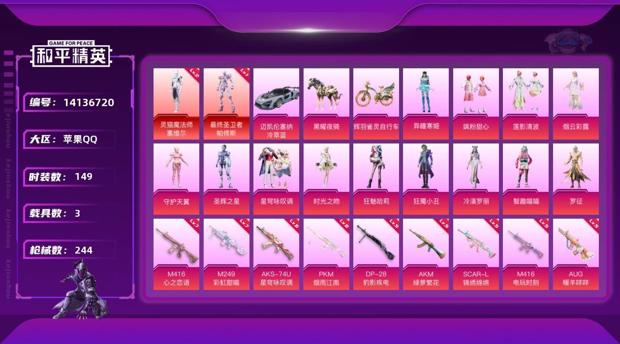 [14136720]【1582】苹果 手Q-2神装-14粉装-12特效枪-3载具-9粉色飞行器-84343热力值-14王牌印记-149套装-244枪皮 【红色神装等级】:灵猫魔法师-塞维尔(二级),最终圣卫者-帕修斯(一级) 【红色角色神装】:灵猫魔法师-塞维尔,最终圣卫者-帕修斯 【热门品类】:角色-忠猛周仓,角色-忠真马岱,角色-忠义严颜,套装-龟仙人 【粉色载具】:迈凯伦塞纳(冷萃蓝),黑曜夜骑,辉羽雀灵自行车 【粉色套装】:粉装-飒粉甜心,粉装-莲影清波,角色-烟云彩露,角色-守护天翼,角色-圣辉之星,粉装-星穹咏叹调,角色-时光之吻,角色-狂魅哈莉,角色-狂魇小丑,角色-冷漠罗丽,角色-智趣喵喵,角色-罗征,角色-异瞳寒姬 【粉色枪皮等级】:AKM-绿萝繁花(五级),SCAR-L-锦绣绵绵(五级),M416-心之恋语(七级),M416-电玩时刻(五级),M416-灵猫魔法师(三级),AUG-暖羊咩咩(五级),Vector-最终圣卫者(三级),AKS-74U-星穹咏叹调(六级),Kar98K-巳巳如意(五级),M249-彩虹甜喵(七级),DP-28-豹影疾电(五级),PKM-江南烟雨(六级) 【粉色枪皮】:AKM-绿萝繁花,SCAR-L-锦绣绵绵,M416-心之恋语,M416-电玩时刻,M416-灵猫魔法师,AUG-暖羊咩咩,Vector-最终圣卫者,AKS-74U-星穹咏叹调,Kar98K-巳巳如意,M249-彩虹甜喵,DP-28-豹影疾电,PKM-江南烟雨 【粉色飞行器】:绯果甜心飞行器,百变魔方飞行器,雀灵庇佑飞行器,时光之誓飞行器,终晖之翼飞行器,智趣喵喵飞行器,灵猫魔法师飞行器,桃源时光飞行器 【粉色降落伞】:恐龙拽拽降落伞,彩虹甜喵降落伞,千面幻镜降落伞,未来歌姬降落伞,闲梦青缨降落伞,萌物绒绒降落伞,圣堂之誓降落伞,江南烟雨降落伞,月影灵韵降落伞,戏水时光降落伞,雪月幻音降落伞,圣辉之星降落伞,智耀战神降落伞,绯果甜心降落伞,星穹咏叹调降落伞,御兔特攻降落伞,幻星舰长降落伞,幻彩电音降落伞,时光之吻降落伞,时光之誓降落伞,双重狂想降落伞,最终圣卫者降落伞,智趣喵喵降落伞,荧海星豚降落伞,灵猫魔法师降落伞,异瞳寒姬降落伞 【稀有套装】:套装-龟仙人,套装-巳巳如意,套装-小鸟芋圆,套装-云鹰凌岚,套装-雏菊兔兔,套装-萝兰蝴蝶,角色-狂花道·娜可露露,套装-糖糖葫