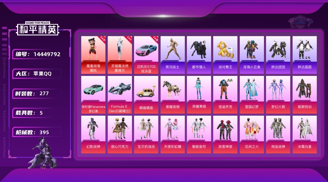 [14449792]【1610】苹果 手Q-无敌战神框-2神装-38粉装-23特效枪-5载具-8粉色飞行器-147248热力值-17王牌印记-277套装-395枪皮