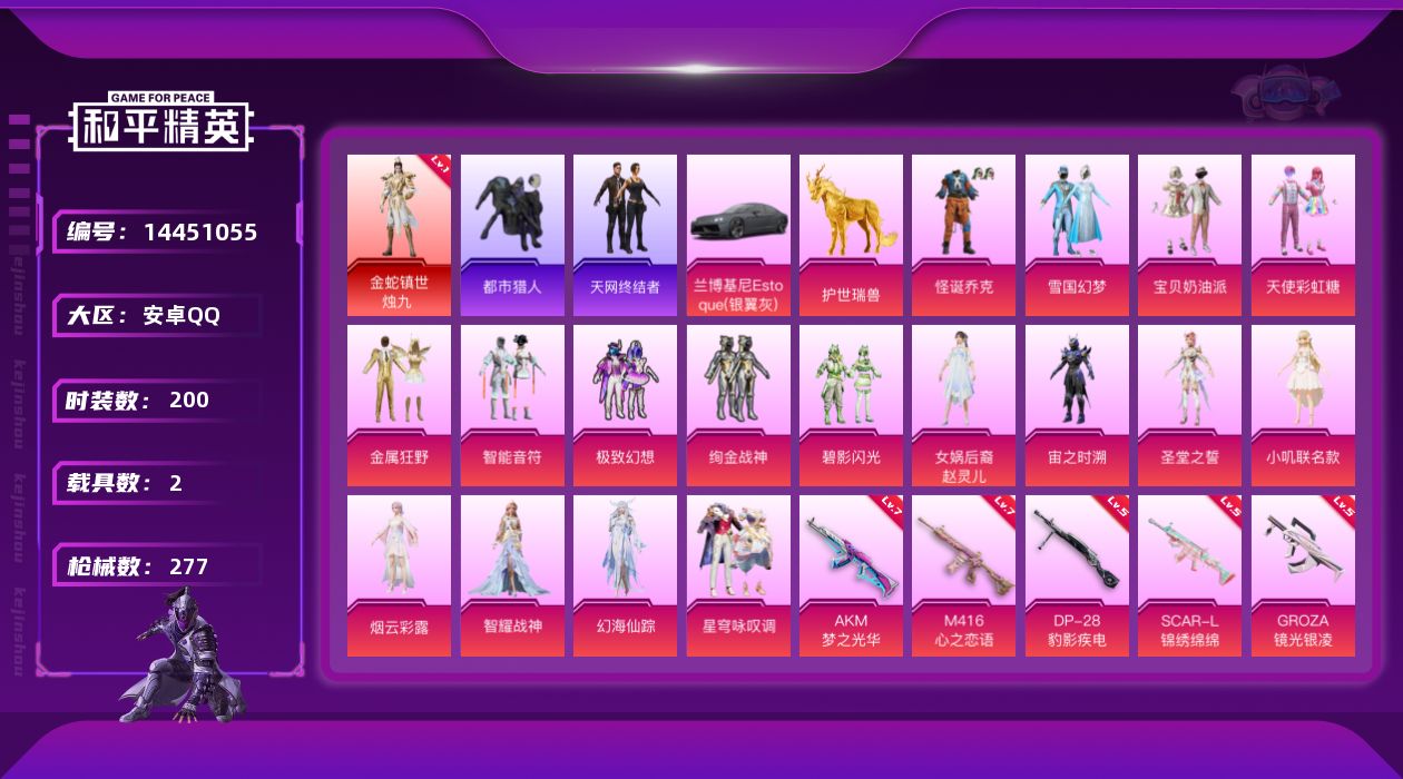 [14451055]【1614】安卓 手Q-无敌战神框-1神装-17粉装-8特效枪-2载具-7粉色飞行器-93866热力值-19王牌印记-200套装-277枪皮 【红色神装等级】:金蛇镇世-烛九(一级) 【红色角色神装】:金蛇镇世-烛九 【热门品类】:粉装-怪诞乔克,粉装-雪国幻梦,套装-浪漫天命,套装-都市猎人,套装-天网终结者,套装-金羽特工,套装-龟仙人,套装-暗影哥特,套装-粉红小猪,套装-红熊茄茄 【粉色载具】:兰博基尼Estoque(银翼灰),僚机-圣域龙宝,护世瑞兽 【粉色套装】:粉装-怪诞乔克,粉装-宝贝奶油派,粉装-天使彩虹糖,粉装-雪国幻梦,粉装-金属狂野,粉装-智能音符,粉装-极致幻想,粉装-绚金战神,粉装-碧影闪光,女娲后裔-赵灵儿,角色-宙之时溯,角色-圣堂之誓,角色-小叽联名款,角色-烟云彩露,角色-智耀战神,角色-幻海仙踪,粉装-星穹咏叹调 【粉色枪皮等级】:AKM-梦之光华(七级),SCAR-L-锦绣绵绵(五级),M416-心之恋语(七级),M416-风花雪月(四级),GROZA-镜光银凌(五级),AKS-74U-星穹咏叹调(五级),Kar98K-巳巳如意(五级),DP-28-豹影疾电(五级) 【粉色枪皮】:AKM-梦之光华,SCAR-L-锦绣绵绵,M416-心之恋语,M416-风花雪月,GROZA-镜光银凌,AKS-74U-星穹咏叹调,Kar98K-巳巳如意,DP-28-豹影疾电 【粉色飞行器】:歌者泠鸢飞行器,拂晓神骑飞行器,龙翔九天飞行器,凤舞九天飞行器,万象金身飞行器,圣域金龙飞行器,绯果甜心飞行器 【粉色降落伞】:幻影战神降落伞,甜心宝贝降落伞,炫紫旋律降落伞,神秘黑猫降落伞,暗翼战神降落伞,齐天大圣降落伞,蓝莓炮弹降落伞,天之羽翼降落伞,恐龙拽拽降落伞,环太平洋降落伞,音爆索尼克降落伞,仲夏莫吉托降落伞,圣堂之誓降落伞,猪猪侠降落伞,绝色倾城降落伞,月影灵韵降落伞,金蛇镇世降落伞,鬼刀降落伞,桃粉嫣然降落伞,圣域龙灵降落伞,绯果甜心降落伞,幻海仙踪降落伞,星穹咏叹调降落伞,幻彩电音降落伞 【稀有套装】:套装-龟仙人,套装-巳巳如意,套装-雏菊兔兔,套装-萝兰蝴蝶,套装-糖糖葫芦,套装-青团波波,角色-俏兔智灵,套装-燕燕于飞,套装-鱼渊荷华,角色-海琴烟,套装-闪电轻猫,套装-粉恋花,套装-紫幽梦,套装-蓝冰羽,角色-猎影月神,角色-幽澜祭