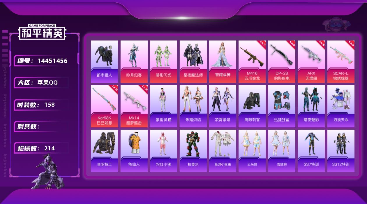 [14451456]【1616】苹果 手Q-4粉装-6特效枪-0载具-1粉色飞行器-62858热力值-6王牌印记-158套装-214枪皮 【热门品类】:套装-浪漫天命,套装-都市猎人,套装-金羽特工,套装-龟仙人,套装-粉红小猪 【粉色套装】:粉装-吟月归客,粉装-碧影闪光,粉装-星夜魔法师,角色-智耀战神 【粉色枪皮等级】:SCAR-L-锦绣绵绵(五级),M416-五爪金龙(七级),ARX-无垠阁(五级),Kar98K-巳巳如意(五级),Mk14-甜梦熊击(五级),DP-28-豹影疾电(五级) 【粉色枪皮】:SCAR-L-锦绣绵绵,M416-五爪金龙,ARX-无垠阁,Kar98K-巳巳如意,Mk14-甜梦熊击,DP-28-豹影疾电 【粉色飞行器】:齐天大圣飞行器 【粉色降落伞】:四圣焕新降落伞,王牌四分卫降落伞,烈焰拳霸降落伞,机甲封神降落伞,焰龙焚天降落伞,蓝莓炮弹降落伞,筑梦精灵降落伞,环太平洋降落伞,彩虹甜喵降落伞,暗夜鎏金降落伞,黄族统领降落伞,精灵梦叶罗丽降落伞,荧海星豚降落伞 【稀有套装】:套装-龟仙人,角色-拉斐尔,套装-星渊小夜曲,套装-云朵鹅,套装-雪绒豹,套装-朱霞炽焰,套装-凌霄紫焰,角色-紫俏灵猫 【稀有枪皮】:AKM-奇异狩猎者,AKM-彩虹符号,AKM-环太平洋,AKM-生命誓言,AKM-破晓战魂,AKM-萌趣颜团子,AKM-虎虎生威,AKM-龙的传人,M16A4-幻世战舞者,M16A4-甜心亚梦,M16A4-千金淑猫,SCAR-L-夜灯,SCAR-L-炫彩节奏,SCAR-L-玉兔迎春,SCAR-L-红色方程式,SCAR-L-黄金龙骨,M416-夜灯,M416-糯团青竹,M416-红色方程式,M416-绯红前夜,M416-蓝色火焰,GROZA-2B战斗服款,GROZA-异彩先驱,GROZA-彩虹符号,GROZA-影袭,GROZA-梨园星光,GROZA-田园牧歌,AUG-青春冒险家,QBZ-彩虹符号,QBZ-未来歌姬,QBZ-飞驰魅影,M762-天降萌叽,M762-奇异狩猎者,M762-牛气冲天,M762-瑞龙福将,M762-绯红前夜,M762-诡娃娃,M762-云朵鹅,Mk47-洛神天依,Mk47-青春冒险家,G36C-时空追击者,AC-VAL-天降萌叽,AC-VAL-甜心亚梦,蜜獾-天降萌叽,蜜獾-娇憨猪猪,ARX-凌霄紫焰,UZI-啾咪啾咪,UZI-