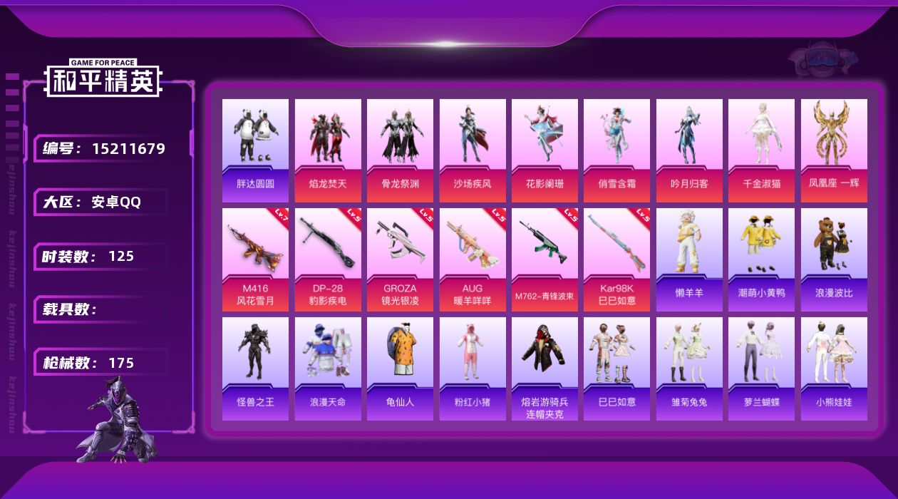 [15211679]【1661】安卓 手Q-8粉装-6特效枪-0载具-2粉色飞行器-53624热力值-6王牌印记-125套装-175枪皮