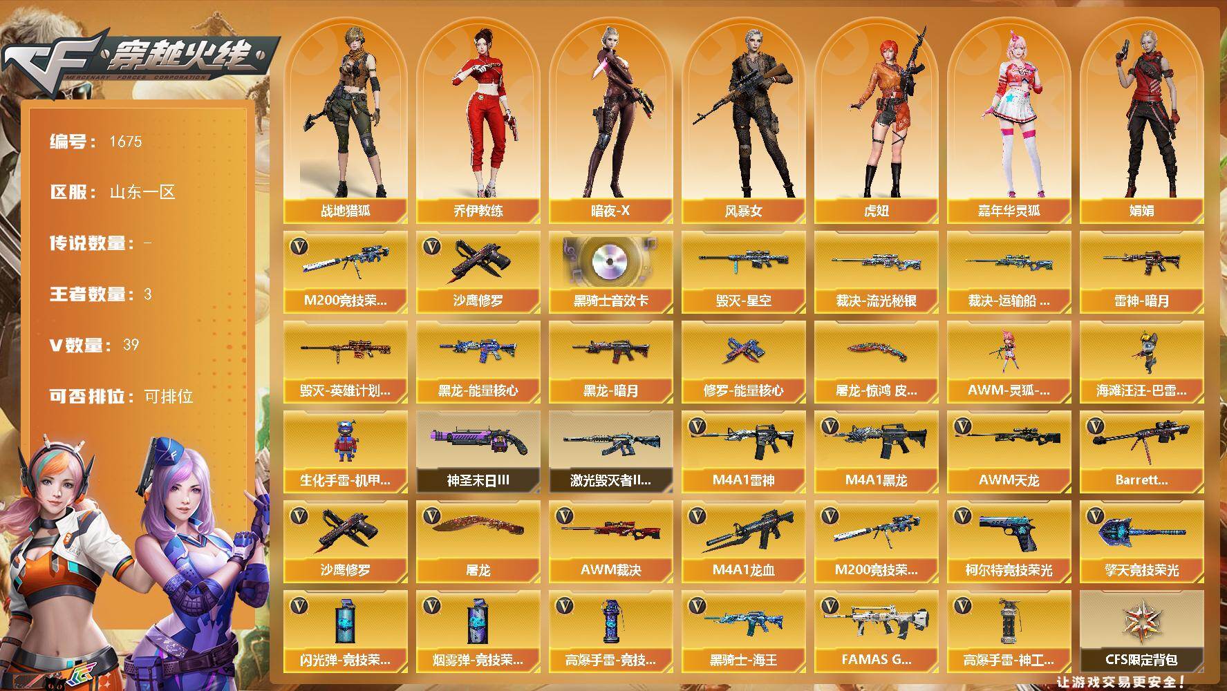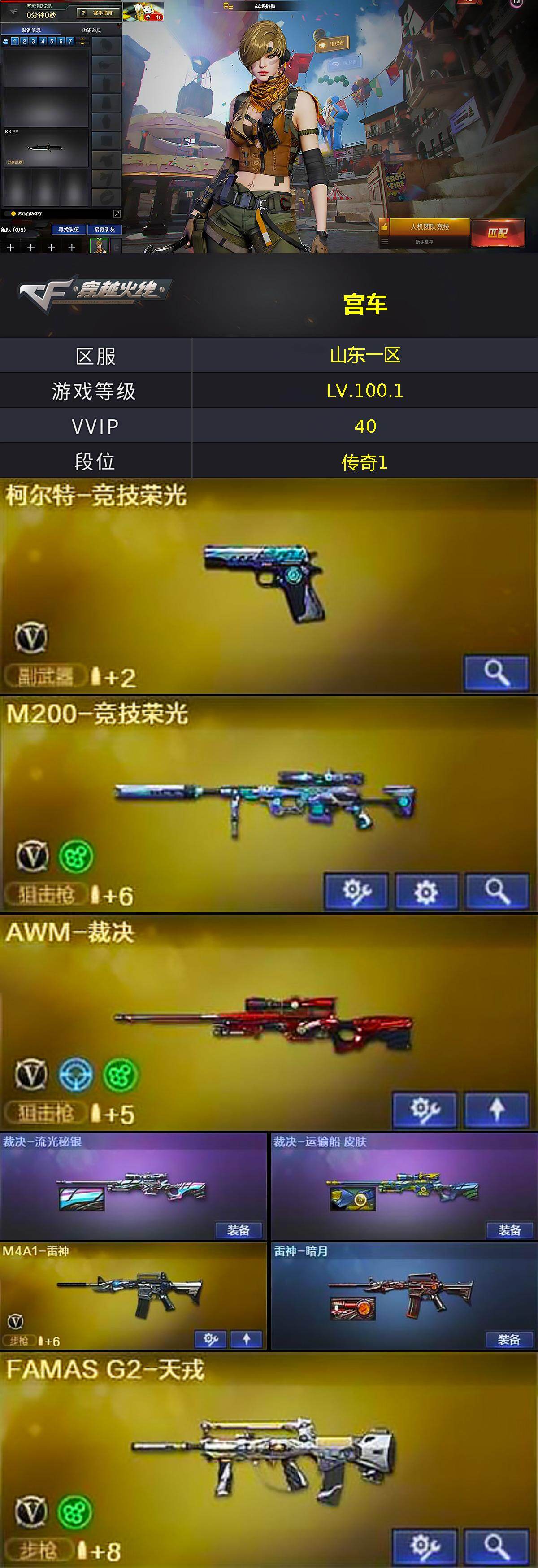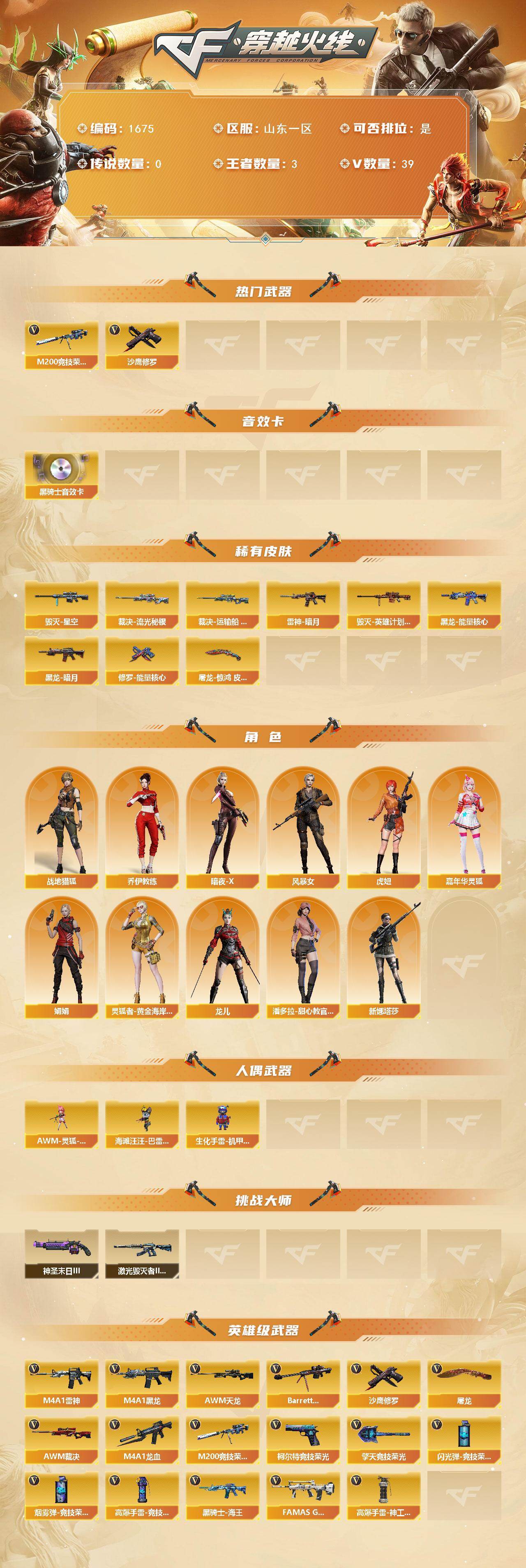 [15806308]山东一区-39V-3王者-0炫金 【热门武器】:M200-竞技荣光,沙鹰-修罗 【音效卡】:M4A1-黑骑士音效卡 【皮肤】:裁决-流光秘银,裁决-运输船 皮肤,雷神-暗月,毁灭-星空,毁灭-英雄计划 皮肤,黑龙-能量核心,黑龙-暗月,修罗-能量核心,屠龙-惊鸿 皮肤 【角色】:战地猎狐,乔伊教练,暗夜-X,风暴女,虎妞,嘉年华灵狐,娟娟,灵狐者-黄金海岸,龙儿,潘多拉-甜心教官,新娜塔莎 【人偶武器】:AWM-灵狐-15周年嘉年华,海滩汪汪-巴雷特,生化手雷-机甲核心 【挑战大师】:激光毁灭者III-白马银枪,神圣爆裂者-末日III 【英雄级武器】:M4A1-黑龙,M4A1-雷神,M4A1-龙血,FAMAS G2-天戎,黑骑士-海王,AWM-天龙*2,Barrett-毁灭*2,AWM-裁决,M200-竞技荣光,沙鹰-修罗,柯尔特-竞技荣光,屠龙*2,擎天-竞技荣光,高爆手雷-竞技荣光*5,高爆手雷-神工天巧,闪光弹-竞技荣光*5,烟雾弹-竞技荣光*5 【道具】:CFS限定背包,冰冰企鹅背包,超级背包,救世主-黑桃战神,绿色巨人,灵魂忍者*2,变异宝贝,迷雾幽灵*2,夺命之镰,防化服*2,金色流光-枪王排位*2,星辰流光-枪王排位,枪王排位29赛季金色流光,防弹头盔*3,防弹衣*3,C4工具钳*2,手雷包*2 【特殊枪械】: