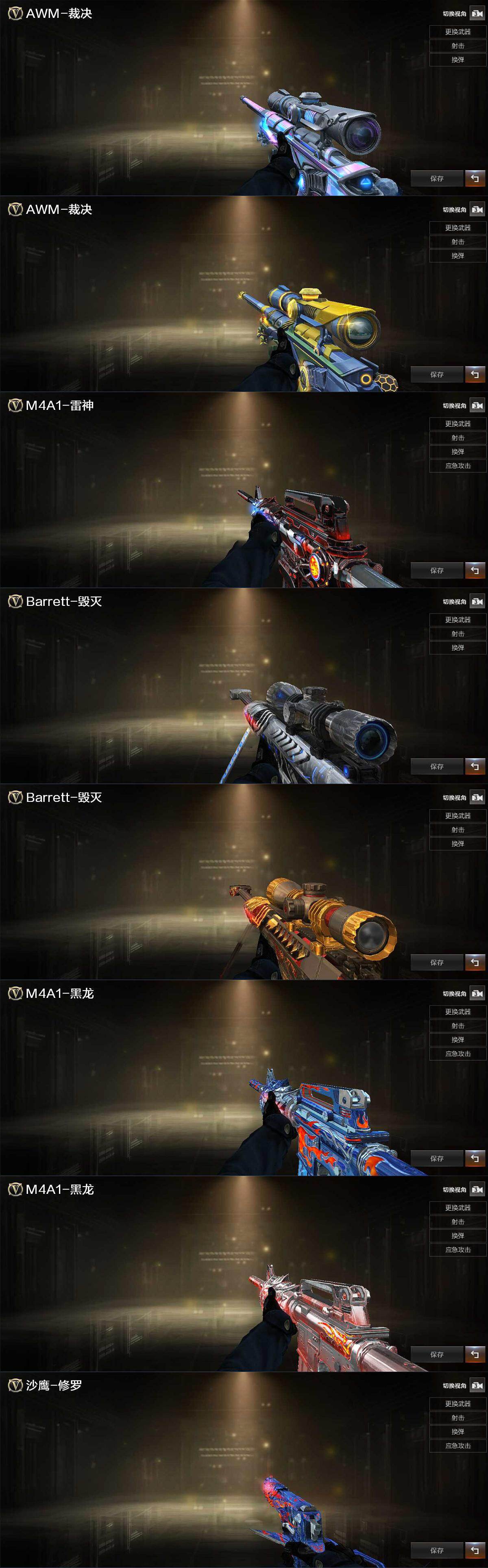 【英雄级武器】:M4A1-黑龙,M4A1-雷神,M4A1-龙血,FAMAS G2-天戎,黑骑士-海王,AWM-天龙*2,Barrett-毁灭*2,AWM-裁决,M200-竞技荣光,沙鹰-修罗,柯尔特-竞技荣光,屠龙*2,擎天-竞技荣光,高爆手雷-竞技荣光*5,高爆手雷-神工天巧,闪光弹-竞技荣光*5,烟雾弹-竞技荣光*5