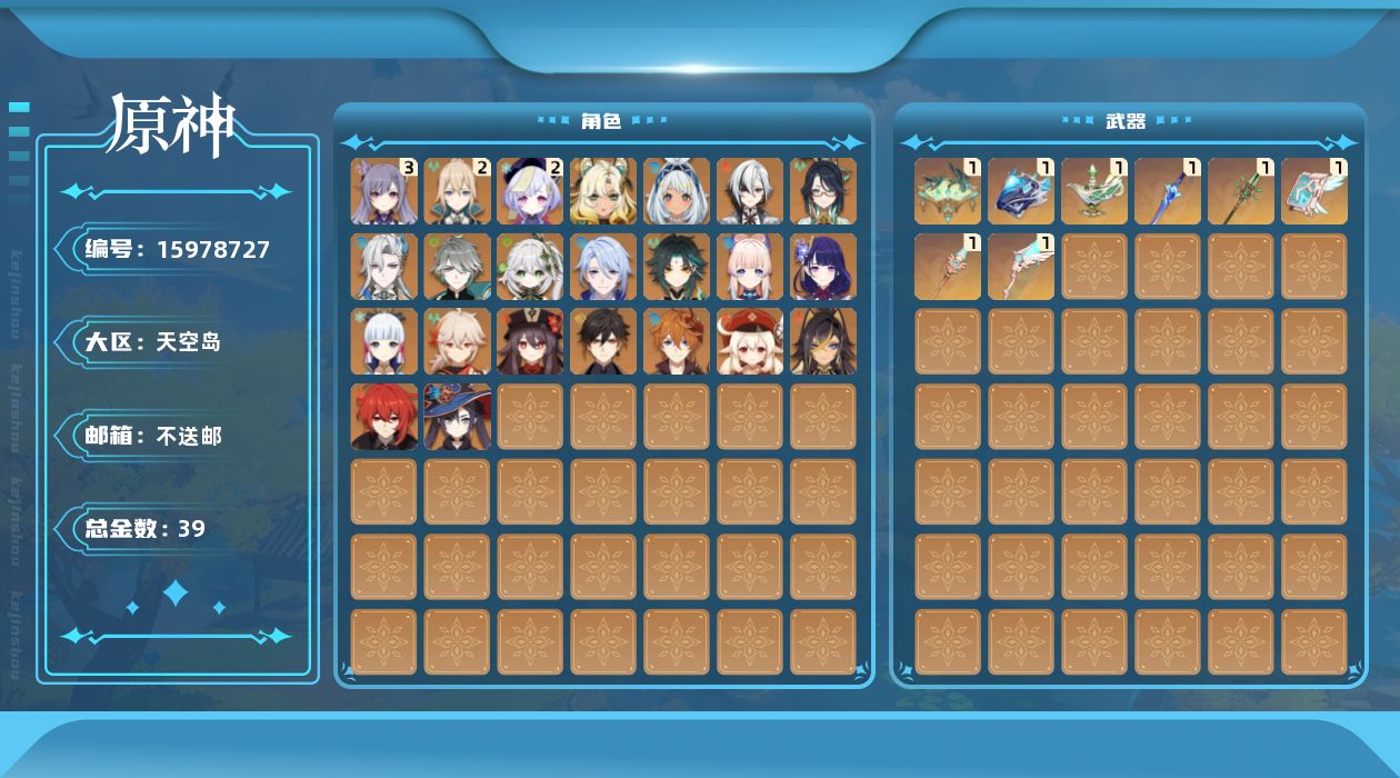 0命阿蕾奇诺,0命闲云,0命那维莱特,0命迪希雅,0命艾尔海森,0命纳西妲,0命神里绫人,0命雷电将军,0命枫原万叶,0命神里绫华,0命钟离,0命胡桃,0命魈,0命可莉,0命达达利亚,0命珊瑚宫心海,3命刻晴,2命七七,2命琴,0命莫娜,0命迪卢克,0命希诺宁,0命玛拉妮,精1鹤鸣余音,精1万世流涌大典,精1千夜浮梦,精1波乱月白经津,精1和璞鸢,精1天空之脊,精1天空之翼,精1天空之卷