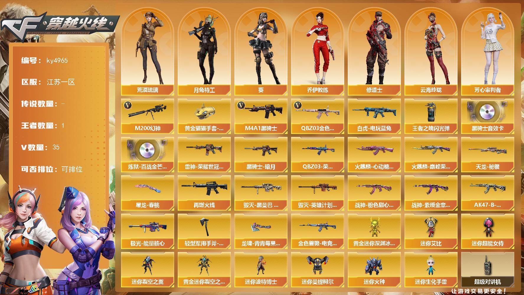 [16066691]江苏一区-35V-1王者-0炫金 【热门武器】:QBZ03-金色蔷薇,M200-幻神,白虎-电玩蓝兔,M4A1-黑骑士*2,黄金猫猫手套-白鲨 【王者炫金武器】:王者之魄闪光弹 【音效卡】:M4A1-黑骑士音效卡,炼狱-百战金芒-庆典舞曲音效卡 【皮肤】:QBZ03-荣耀世冠白鲨,金色蔷薇-电竞之星 皮肤,雷神-荣耀世冠AG,M4A1-再燃火线,火麒麟-巅峰荣耀,火麒麟-心动糖果,毁灭-黑曼巴 皮肤,毁灭-英雄计划 皮肤,黑骑士-暗月,战神-粉色甜心皮肤,战神-紫绶金章皮肤,AK47-B-常胜将军-刘备,天龙-秘银,极光-能量核心,屠龙-春桃 皮肤,轻型军用手斧-再燃火线,龙啸-青青莓果 皮肤 【角色】:葵,月兔特工,荒漠琉璃,乔伊教练,修道士,云海玲珑,芳心审判者,风暴女,嘉年华灵狐,娟娟,兰-海滩派对,灵狐者-黄金海岸,灵狐者-七夕宝贝,龙儿,萌儿,潘多拉-甜心教官,潜龙队-X,斯沃特-X,兔囡囡,新娜塔莎,雪莉杨-摸金校尉,影武者-X 【人偶武器】:黄金迷你深渊冰龙*2,迷你裂空之翼,黄金迷你裂空之翼*2,迷你波特博士*4,迷你曼提柯尔,迷你火种,迷你生化手雷,迷你艾比,迷你超能女侍 【暴走生化】:超级对讲机 【挑战大师】:暴君乱世-超越Max,冰龙粉碎者-白马银枪,VEPR-12-金魔,机甲撕裂者III,试炼破坏者III*2,神圣爆裂者-末日III,阐释者III 【英雄级武器】:AK47-火麒麟*2,M4A1-雷神,M4A1-黑骑士*2,黑武士-锦绣游龙,QBZ03-金色蔷薇,AK-47-猩红传说,AK47-B-战神,AK47-B-常胜将军*2,白虎-电玩蓝兔,Barrett-毁灭,Barrett-极光*2,M200-幻神,炼狱-百战金芒,沙鹰-天神,屠龙,龙啸,擎天,麒麟刺-百战金芒,烟雾弹-荣耀世冠EP 【道具】:CFS限定背包,EP战队炫彩背包,Q9战队炫彩背包,亚洲杯纪念炫彩背包,战舰背包,炫彩背包-诺拉,炫彩背包,百战金芒炫彩背包,金狐背包,哔哩哔哩名片,女皇终结者-魔龙之吻,绿色巨人,灵魂忍者,迷雾幽灵,夺命之镰,防化服*2,金色流光-枪王排位*2,星辰流光-枪王排位,流光-鎏金之域,枪王排位28赛季金色流光,枪王排位29赛季金色流光,语音特效-盛典烟火,语音特效-机器人,萌萌小葵表情,电玩兔兔表情,防弹头盔*2,防弹衣*2,C4工具钳*2,手