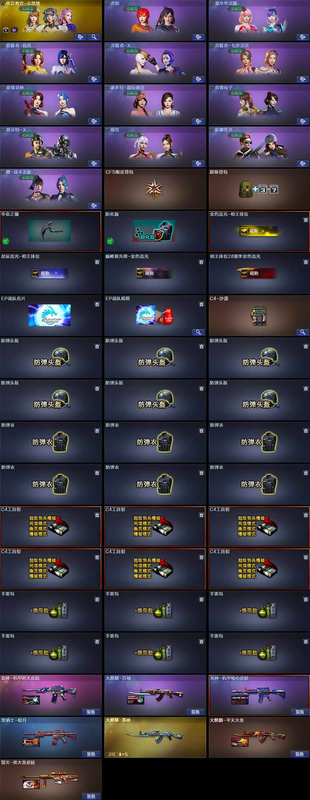 【道具】:CFS限定背包,超级背包,夺命之镰,防化服,金色流光-枪王排位,星辰流光-枪王排位,巅峰赛先锋-金色流光,枪王排位28赛季金色流光,EP战队名片,EP战队喷图,C4-沙漠,防弹头盔*6,防弹衣*6,C4工具钳*6,手雷包*6