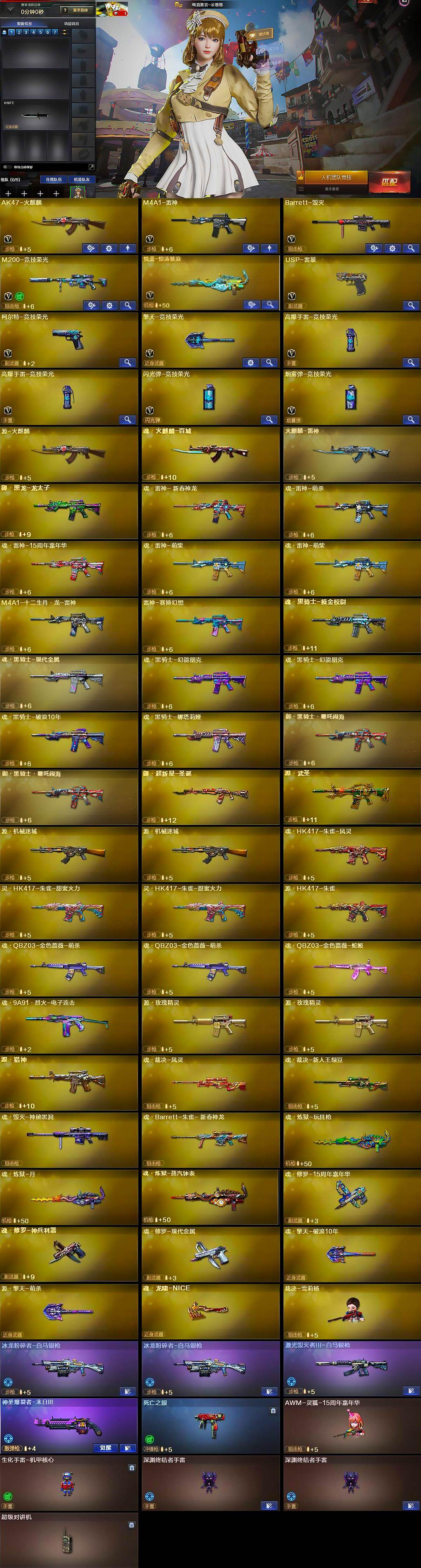 【英雄级武器】:AK47-火麒麟,M4A1-雷神,Barrett-毁灭,M200-竞技荣光,悦蓝-惊涛骇浪-觉醒版,USP-雷暴,柯尔特-竞技荣光,擎天-竞技荣光,高爆手雷-竞技荣光*2,闪光弹-竞技荣光,烟雾弹-竞技荣光