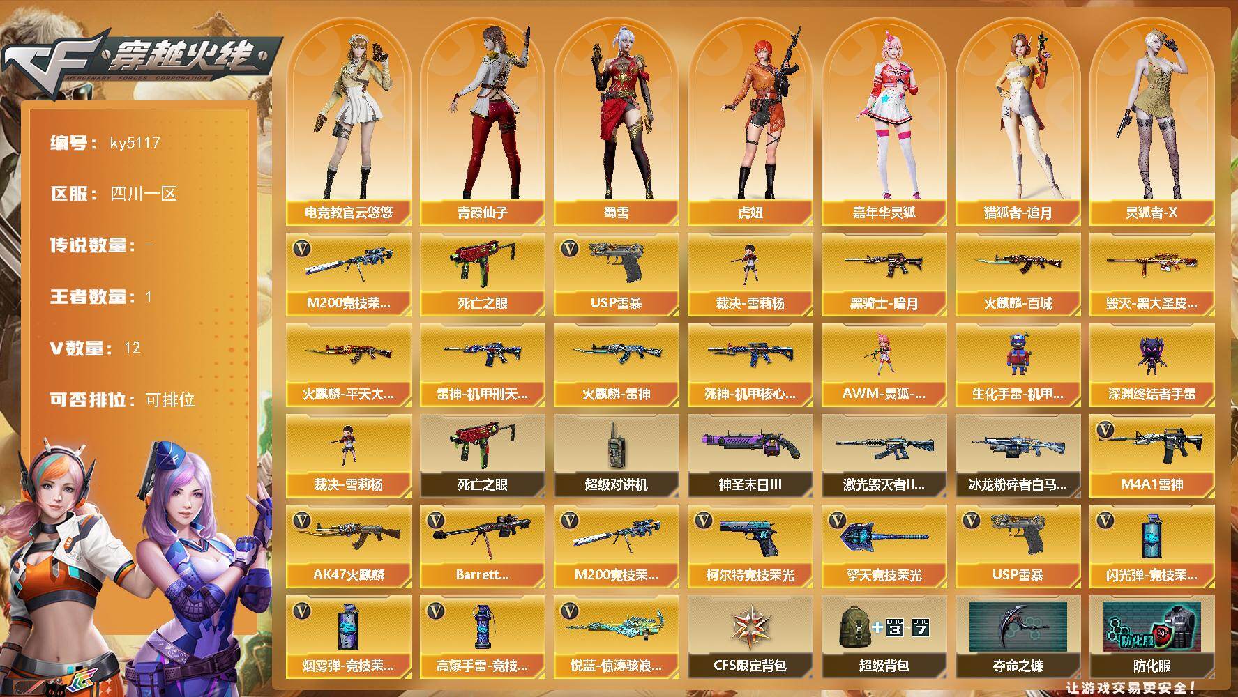 [16067990]四川一区-12V-1王者-0炫金 【热门武器】:M200-竞技荣光,死亡之眼,裁决-雪莉杨,USP-雷暴 【皮肤】:雷神-机甲刑天皮肤,火麒麟-雷神,火麒麟-平天大圣,火麒麟-百城,毁灭-黑大圣皮肤,黑骑士-暗月,死神-机甲核心皮肤 【角色】:电竞教官-云悠悠,虎妞,嘉年华灵狐,猎狐者-追月,灵狐者-X,灵狐者-七夕宝贝,玫瑰花神,潘多拉-甜心教官,青霞仙子,斯沃特-X,蜀雪,兔囡囡,新娜塔莎,樱-战斗天使 【人偶武器】:裁决-雪莉杨,AWM-灵狐-15周年嘉年华,生化手雷-机甲核心,深渊终结者手雷*2 【暴走生化】:死亡之眼,超级对讲机 【挑战大师】:冰龙粉碎者-白马银枪*2,激光毁灭者III-白马银枪,神圣爆裂者-末日III 【英雄级武器】:AK47-火麒麟,M4A1-雷神,Barrett-毁灭,M200-竞技荣光,悦蓝-惊涛骇浪-觉醒版,USP-雷暴,柯尔特-竞技荣光,擎天-竞技荣光,高爆手雷-竞技荣光*2,闪光弹-竞技荣光,烟雾弹-竞技荣光 【道具】:CFS限定背包,超级背包,夺命之镰,防化服,金色流光-枪王排位,星辰流光-枪王排位,巅峰赛先锋-金色流光,枪王排位28赛季金色流光,EP战队名片,EP战队喷图,C4-沙漠,防弹头盔*6,防弹衣*6,C4工具钳*6,手雷包*6 【特殊枪械】: