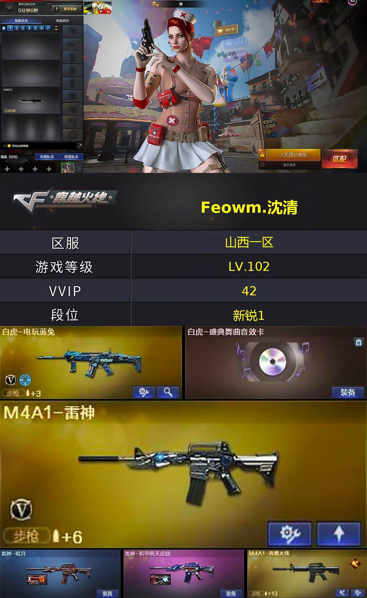 【音效卡】:M4A1-黑骑士音效卡,Barrett-毁灭音效卡,M4A1-赤狱骑士-怀旧音效卡,Barrett-碧霄极光音效卡,白虎-盛典舞曲音效卡,炼狱-百战金芒-庆典舞曲音效卡,死神-雪域霜狐-怀旧音效卡