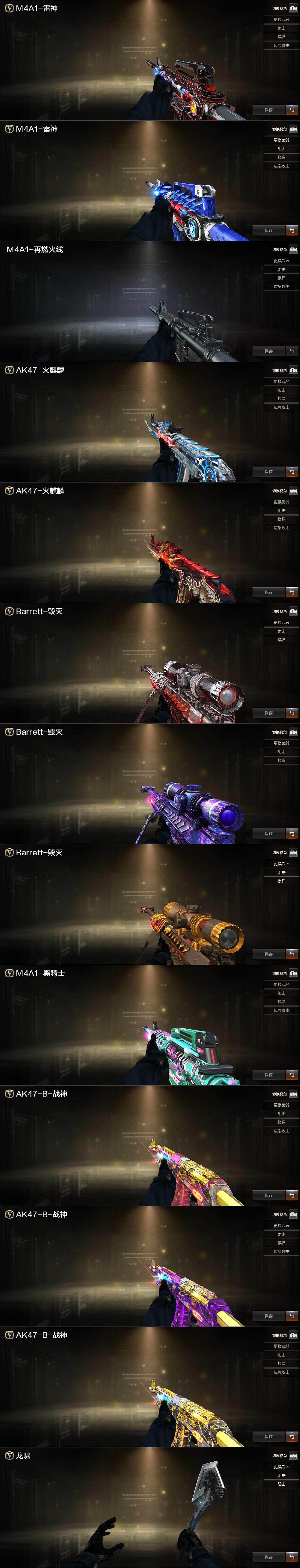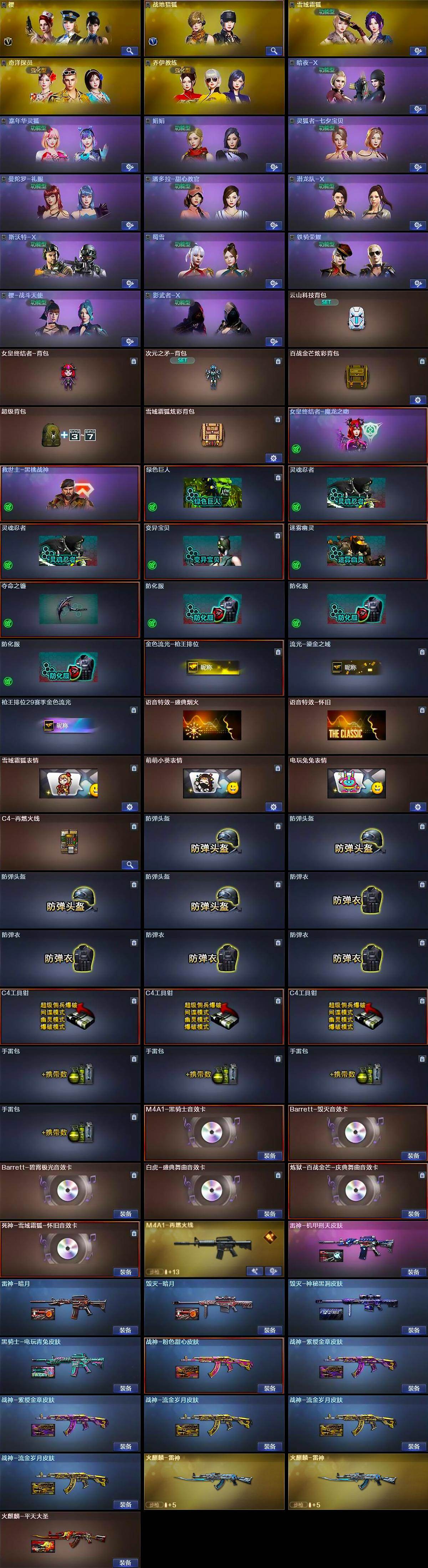 【英雄级武器】:AK47-火麒麟*2,M4A1-雷神,M4A1-黑骑士,无影-神兵利器,死神-雪域霜狐,AK-47-猩红传说*7,AK47-B-战神,黑骑士-海王,AK47-B-常胜将军,白虎-电玩蓝兔,Barrett-毁灭,炼狱-百战金芒,麒麟刺-百战金芒,丛林匕首-玄豹,高爆手雷-雷霆,高爆手雷-玄豹,闪光弹-雷霆,闪光弹-玄豹*2,烟雾弹-雷霆,烟雾弹-玄豹,M4A1-赤狱骑士,Barrett-碧霄极光