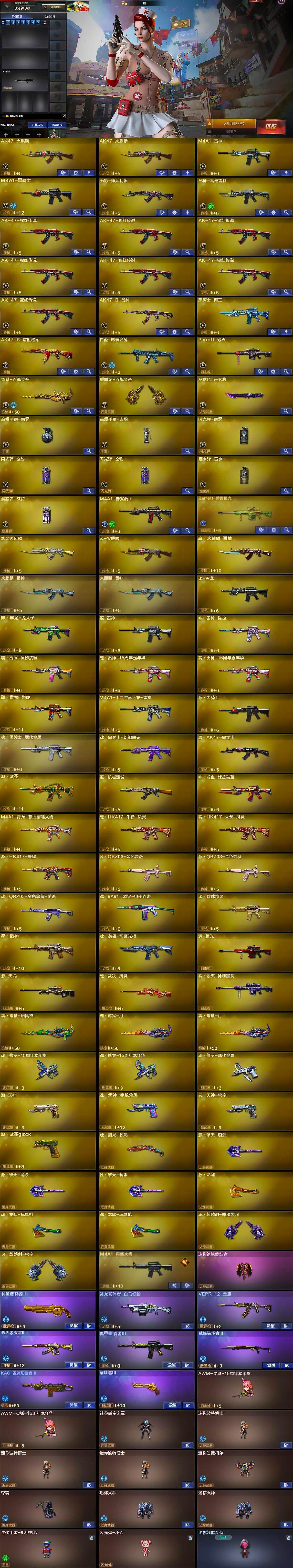 - [16770753]四川一区-48V-8王者-2炫金 【传说武器】:传说圣灵 【传说角色】:传说女帝 【热门武器】:传说圣灵,G36C-幻影,QBZ03-金色蔷薇,M4A1-青龙,修罗-古蛇迷踪,八面凌龙,死亡之眼,QBZ03-街机,RPK-盘龙,加特林-炼狱,羊驼玩偶,金刚伞 【王者炫金武器】:王者风神,炫金骑士,炫金雷神 【音效卡】:Barrett-毁灭音效卡,炼狱-百战金芒-庆典舞曲音效卡,AWM-昌龙-怀旧音效卡 【皮肤】:M4A1-再燃火线,雷神-神秘按键 皮肤,黑骑士-地狱火,无影-暗月,黑武士-典韦皮肤,修罗-能量核心,修罗耀金皮肤,屠龙-春桃 皮肤,轻型军用手斧-再燃火线,龙啸-青青莓果 皮肤 【角色】:战地猎狐,蛇隐宗,初恋灵狐,疾风,葵-赛博朋克,灵狐者-X,龙儿,麻雀,蛇姬,蜀雪,兔囡囡 【人偶武器】:巴雷特-零-水下丽影,黄金迷你深渊冰龙,迷你裂空之翼,迷你火种,迷你生化手雷,生化手雷-机甲核心,灵狐娃娃手雷 【暴走生化】:死亡之眼,超级对讲机 【挑战大师】:激光毁灭者III-白马银枪,VEPR-12-金魔,试炼破坏者III,阐释者III 【英雄级武器】:M4A1-黑龙*2,AK47-无影,M4A1-青龙,M4A1-夜魔,G36C-幻影,黑武士-锦绣游龙,八面凌龙,QBZ03-金色蔷薇,王者冰魄-觉醒版,王者火魄-觉醒版,AWM-天龙,AWM-裁决,RPK-盘龙,加特林-炼狱,炼狱-百战金芒,AA-12-雷霆,COP 357-雷霆王者-觉醒版,破空枪刃-夜魔,修罗-古蛇迷踪,龙啸,马来剑-夜魔,擎天,麒麟刺-百战金芒,高爆手雷-夜魔*4,高爆手雷-古蛇迷踪,闪光弹-雷霆,闪光弹-夜魔*4,闪光弹-雷霆王者-觉醒版*2,烟雾弹-夜魔*4,烟雾弹-古蛇迷踪,烟雾弹-雷霆王者-觉醒版,M4A1-赤狱骑士,M4A1-苍鸣雷神,AWM-昌龙,Barrett-碧霄极光 【道具】:云山科技背包,亚洲杯纪念炫彩背包,古蛇迷踪炫彩背包,百战金芒炫彩背包,超级背包,女皇终结者-魔龙之吻,救世主-黑桃战神,绿色巨人,灵魂忍者,迷雾幽灵,夺命之镰,防化服*3,流光-鎏金之域,流光-再燃火线,枪王排位29赛季金色流光,语音特效-盛典烟火,古蛇迷踪打击特效,蛇隐宗表情,萌萌小葵表情,防弹头盔*3,防弹衣*3,C4工具钳*3,手雷包*4 【特殊枪械】:1盘龙,1炼狱