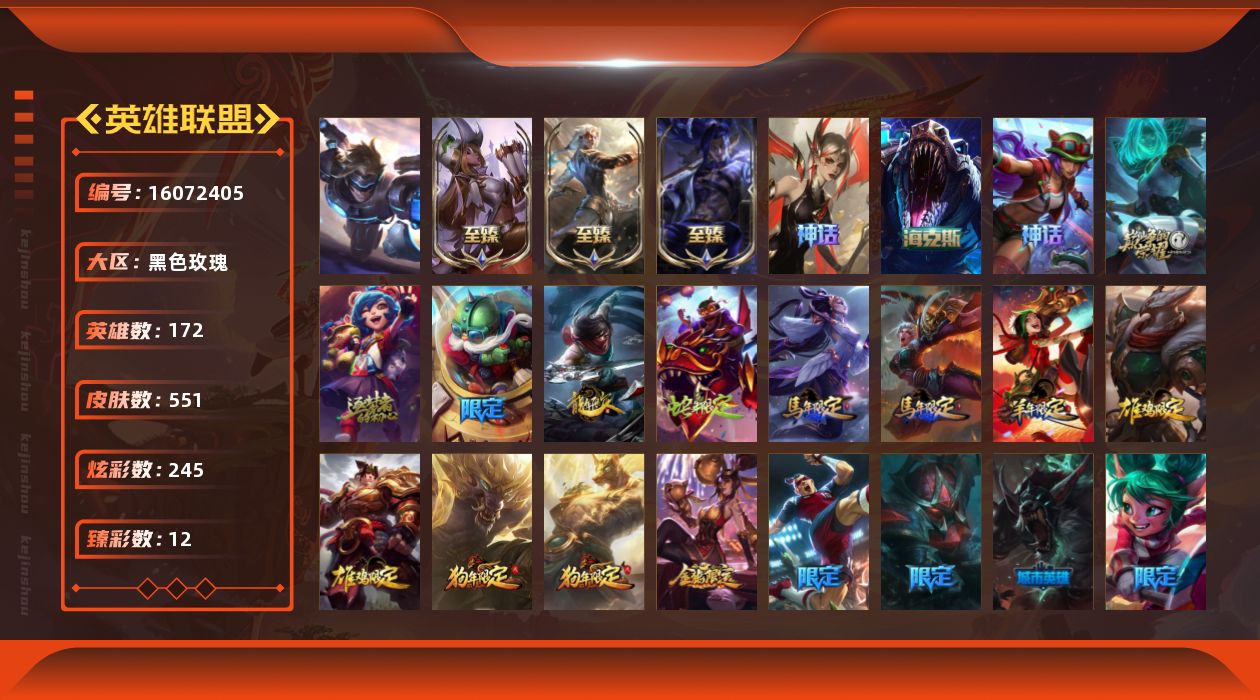 [16072405]【店主推荐捡漏号】青铜段位-172英雄-551皮肤-245炫彩-1终极-9神话-87限定-52传说-143史诗