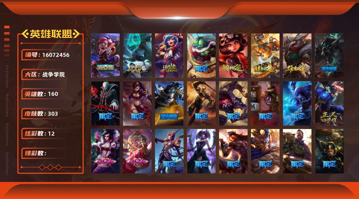 [16072456]【店主推荐捡漏号】未定级段位-160英雄-303皮肤-12炫彩-0终极-3神话-40限定-24传说-80史诗 【珍稀头像】:红包头像 【热门头像】:卡特琳娜的匕首头像 【年限皮肤】:定海神珍孙悟空,你看见过我的熊猫吗安妮,美猴王孙悟空,司马懿仲达 【海克斯皮肤】:海克斯科技安妮 【情人节限定】:甜心宝贝安妮,觅心猎手薇恩 【冰雪限定】:幸福女神乐芙兰,圣诞开心鬼提莫,圣诞狂欢努努和威朗普,阿木木“主人不要我了”,平安夜女神娑娜,喜庆之树茂凯,雪默丁格,圣诞老人古拉加斯,圣诞驯鹿克格莫,冰雪节辛吉德,冰雪节玛尔扎哈 【神话皮肤】:十周年纪念安妮,源代码乐芙兰,海克斯科技安妮 【限定皮肤】:诺斯费拉图弗拉基米尔,冠军典狱长锤石,Fnatic嘉文四世,暗杀星蒙多,SKTT1李青,SSW辛吉德,胜利女神伊莉丝,胜利女神莫甘娜,胜利女神希维尔,胜利之树茂凯,胜利枪神格雷福斯,海贼瑞兹,南瓜头费德提克,鬼影重重魔腾,鬼影森森茂凯,蓝色忧郁崔斯特,女猎手希维尔,外星装甲库奇,暗影沃里克,都铎王朝图奇,防暴士兵辛吉德,防暴天使凯尔,警用试作体K9内瑟斯 【传说皮肤】:魔幻卡牌崔斯特,血石领主弗拉基米尔,大天使长米迦勒凯尔,约德尔国队长提莫,女皇艾希,绅士科加斯,律政大亨蒙多,电玩女神娑娜,女主播迦娜,红色男爵库奇,最终BOSS维迦,女警狙击凯特琳,陆地王者4WD布里茨,苹果机器人布里茨,冰川巨兽墨菲特,丧尸布兰德,第三类接触黑默丁格,炼狱魔犬内瑟斯,死亡骑士盖伦,枯萎之壤泽拉斯,焰尾妖狐阿狸,符文战熊沃利贝尔,苍穹之光韦鲁斯,泳池派对吉格斯 【史诗皮肤】:安伯斯与提妮,科学怪熊的新娘安妮,铁钩船长费德提克,重生之沙费德提克,圣光审判凯尔,战争机器赛恩,战场公主希维尔,钢铁之心希维尔,月光女神阿忒弥斯索拉卡,兔宝宝提莫,火箭达人崔丝塔娜,荒野豺狼沃里克,女船长厄运小姐,国王泰达米尔,百夫长贾克斯,黑色荆棘莫甘娜,炼金狂士辛吉德,死神卡尔萨斯,小小骑士阿木木,熔火之心拉莫斯,贵族血统萨科,飞越疯人院萨科,武动巅峰萨科,战争血统蒙多,掠星魔刃卡萨丁,海克斯科技迦娜,寒冰女皇迦娜,血石诅咒塔里克,穿着正装的恶魔维迦,北领前线斯维因,抵抗军天使凯特琳,黑曜石守护者墨菲特,无畏号墨菲特,蓝焰梦魔魔腾,枯萎之壤雷克顿,龙骑统帅嘉文四世,凯旋英雄嘉文四世,灵骨工匠奥莉安娜,V字仇杀者布兰德,防弹
