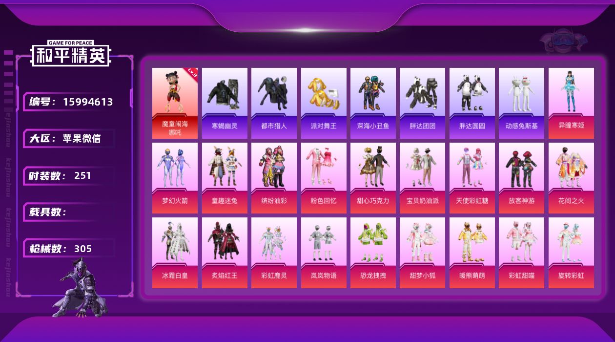 [15994613]苹果 微信-1神装-32粉装-14特效枪-0载具-10粉色飞行器-119523热力值-18王牌印记-251套装-305枪皮【红色神装等级】:魔童闹海-哪吒(三级)【红色角色神装】:魔童闹海-哪吒【热门品类】:粉装-梦幻火箭,粉装-童趣迷兔,粉装-缤纷油彩,套装-寒蝎幽灵,套装-浪漫天命,套装-都市猎人,套装-派对舞王,套装-深海小丑鱼,套装-小丑鱼,套装-胖达团团,套装-胖达圆圆,套装-动感兔斯基人偶服,角色-2B战斗服款,套装-龟仙人,套装-潮萌小黄鸭,套装-暗影哥特,套装-糯粉咩咩,角色-8号机,角色-Mark.06【粉色套装】:粉装-粉色回忆,粉装-甜心巧克力,粉装-宝贝奶油派,粉装-天使彩虹糖,粉装-梦幻火箭,粉装-缤纷油彩,粉装-放客神游,粉装-花间之火,粉装-冰霜白皇,粉装-童趣迷兔,粉装-炙焰红王,粉装-彩虹鹿灵,粉装-岚岚物语,粉装-恐龙拽拽,粉装-甜梦小狐,粉装-暖熊萌萌,粉装-彩虹甜喵,粉装-旋转彩虹,粉装-冰川幽秘,粉装-冰川红玫,粉装-第五大道,粉装-仲夏莫吉托,角色-白勺歌姬,粉装-炫光之旅,角色-蔷薇星,角色-水仙星,角色-星梦奇缘,角色-初号机 觉醒Ver.,角色-千金淑猫,角色-萨利娅,粉装-幻彩电音,角色-异瞳寒姬【粉色枪皮等级】:SCAR-L-青春物语(一级),SCAR-L-纯梦嫁纱(四级),M416-五爪金龙(七级),GROZA-旋转彩虹(六级),UMP45-相思残雪(二级),UMP45-恐龙拽拽(七级),AKS-74U-星穹咏叹调(六级),P90-魔童闹海 敖丙(三级),Kar98K-巳巳如意(五级),Mk14-盛世惊鸿(三级),M417-第五大道(五级),M249-彩虹甜喵(四级),DP-28-豹影疾电(五级),MG3-洛神天依(二【粉色枪皮】:SCAR-L-青春物语,SCAR-L-纯梦嫁纱,M416-五爪金龙,GROZA-旋转彩虹,UMP45-相思残雪,UMP45-恐龙拽拽,AKS-74U-星穹咏叹调,P90-魔童闹海 敖丙,Kar98K-巳巳如意,Mk14-盛世惊鸿,M417-第五大道,M249-彩虹甜喵,DP-28-豹影疾电,MG3-洛神天依【粉色飞行器】:相思残雪飞行器,超新星飞行器,镜域双华-灵镜之阶,龙翔九天飞行器,圣域金龙飞行器,雀灵庇佑飞行器,灵珠游龙飞行器,暮色之舞飞行器