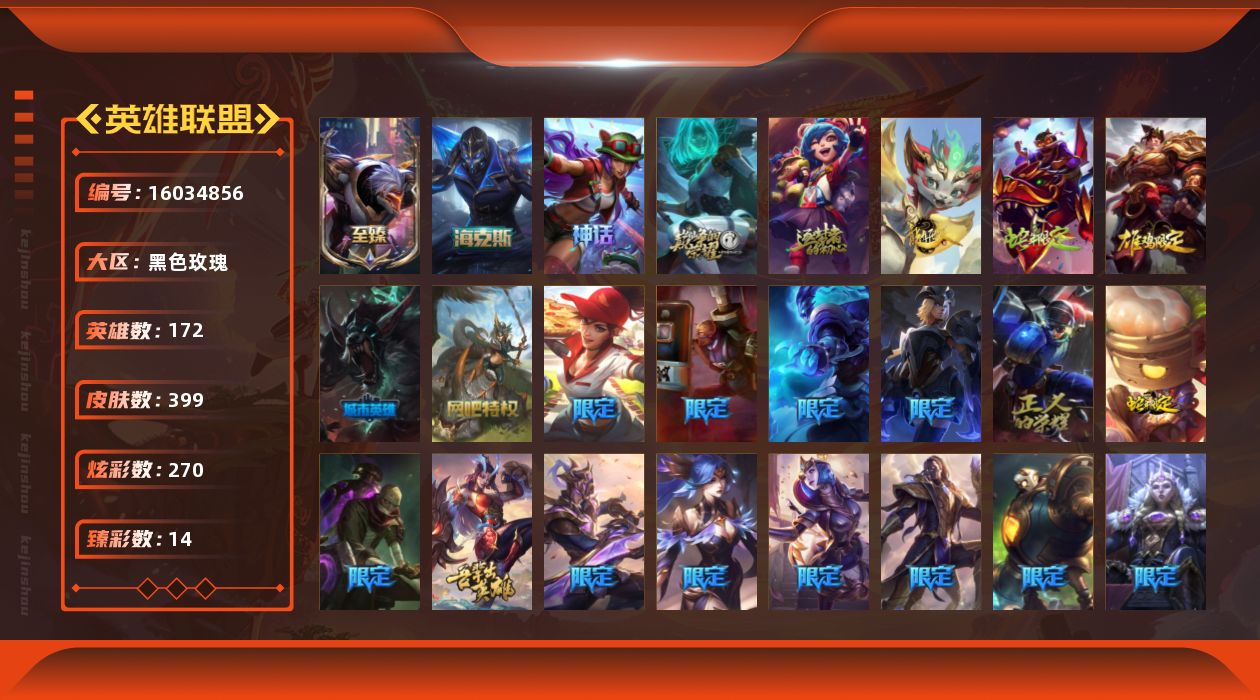 [16034856]【店主推荐捡漏号】未定级段位-172英雄-399皮肤-270炫彩-0终极-6神话-43限定-39传说-93史诗 【热门头像】:爱情之歌头像 【至臻皮肤】:至臻源计划阴劫 【臻彩皮肤】:天龙之子卡莎飞龙乘云,无畏骑士瑟庄妮赤子初心,西部魔影卢锡安贝利尔之怠,黎明使者锐雯黑夜使者,泳池派对奥莉安娜优雅珠光鲸,霸天巨兽雪崩墨菲特,星之守护者霞烈羽,玉剑传说苍鸾丁香,灵魂莲华亚索霜见之时,可爱可爱粉红红布里茨,战斗学院盖伦不死鸟,魔女阿卡丽虚荣,净雪之月莫甘娜冬虹 【年限皮肤】:神龙之翼库奇,张辽文远,天龙之子斯莫德,点心宝贝阿木木 【海克斯皮肤】:海克斯科技卡萨丁 【冰雪限定】:幸福女神乐芙兰,冰封王子蒙多,邪恶圣诞老人维迦,夺命美人卡特琳娜,圣诞驯鹿克格莫,魄罗骑士瑟庄妮,冰雪节玛尔扎哈 【神话皮肤】:十周年纪念安妮,源代码乐芙兰,十五周年纪念希维尔,神凰行者瑞羽圣凰艾尼维亚,海克斯科技卡萨丁,至臻源计划阴劫 【限定皮肤】:送披萨的小姐姐希维尔,冠军典狱长锤石,冠军之血希瓦娜,Fnatic古拉加斯,Fnatic库奇,SKTT1劫,SSW锤石,SKTT1阿利斯塔,SKTT1阿兹尔,SKTT1卡莉丝塔,暗裔英雄盖伦,胜利女神奥莉安娜,胜利枪神卢锡安,胜利机器人布里茨,胜利女神瑟庄妮,胜利凤凰艾尼维亚,胜利之王泰达米尔,胜利巨口克格莫,胜利女神娑娜,胜利剑圣易,鬼影森森茂凯,无头骑士赫卡里姆,魅惑女巫妮蔻,泳池派对格雷福斯,泳池派对凯特琳,泳池派对普朗克,暗影沃里克,野兽猎人瑟庄妮,玉剑传说舞龙卫,防暴士兵辛吉德,防暴天使凯尔,双城之战2微光实验室辛吉德 【传说皮肤】:铁哥们儿奥拉夫,魔幻卡牌崔斯特,大天使长米迦勒凯尔,恶魔男爵瑞兹,提莫约德尔人的一大步,烈焰雄心崔丝塔娜,女皇艾希,源计划联合艾希,魔女伊芙琳,绅士科加斯,战地巨兽科加斯,双重冰晶艾尼维亚,黯晶凤凰艾尼维亚,律政大亨蒙多,电玩女神娑娜,红色男爵库奇,最终BOSS维迦,未来战士凯特琳,冰川巨兽墨菲特,神拳李青,源计划净化薇恩,驯龙学者黑默丁格,炼狱魔犬内瑟斯,屠龙勇士潘森,腥红之月鬼武姬阿卡丽,钢铁军团盖伦,绝息圣堂锐雯,黯黑魔龙希瓦娜,冰霜亚龙希瓦娜,偶像歌手阿狸,符文战熊沃利贝尔,泳池派对吉格斯,灌篮高手德莱厄斯,神王德莱厄斯,蔷薇绅士杰斯,神龙尊者夜月幻龙亚索,星之守护者金克丝,暗星锤石,源计划毁灭派克
