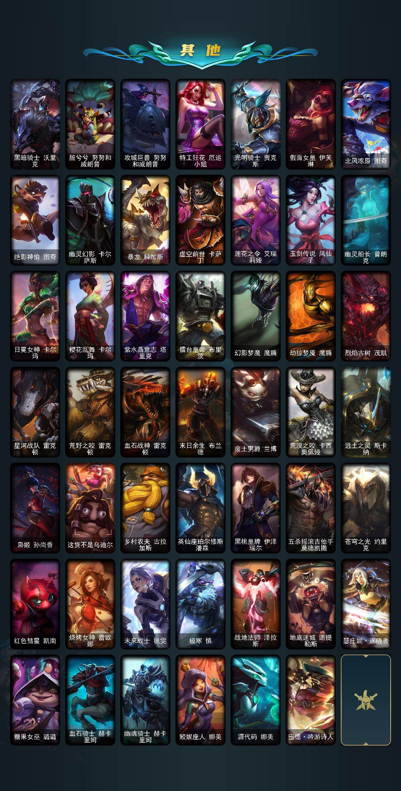 【其他皮肤1】:银河魔装机神安妮,黑暗骑士奥拉夫,风执事加里奥,逍遥赌侠崔斯特,深渊巨蟹厄加特,社会名流乐芙兰,黑潮弗拉基米尔,黑暗骑士沃里克,脏兮兮努努和威朗普,攻城巨兽努努和威朗普,特工狂花厄运小姐,光明骑士贾克斯,假面女皇伊芙琳,北风冻原图奇,绝影神偷图奇,幽灵幻影卡尔萨斯,暴龙科加斯,虚空前世卡萨丁,莲花之令艾瑞莉娅,玉剑传说风仙子,幽灵船长普朗克,日冕女神卡尔玛,樱花乱舞卡尔玛,紫水晶意志塔里克,擂台皇帝布里茨,幻影梦魔魔腾,劫掠梦魇魔腾,烈焰古树茂凯,星河战队雷克顿,荒野之咬雷克顿,血石战神雷克顿,末日余生布兰德,废土男爵兰博,荒漠之咬卡西奥佩娅,远土之灵斯卡纳,枭姬孙尚香,这货不是乌迪尔,乡村农夫古拉加斯,英仙座珀尔修斯潘森,黑桃皇牌伊泽瑞尔,五杀摇滚吉他手莫德凯撒