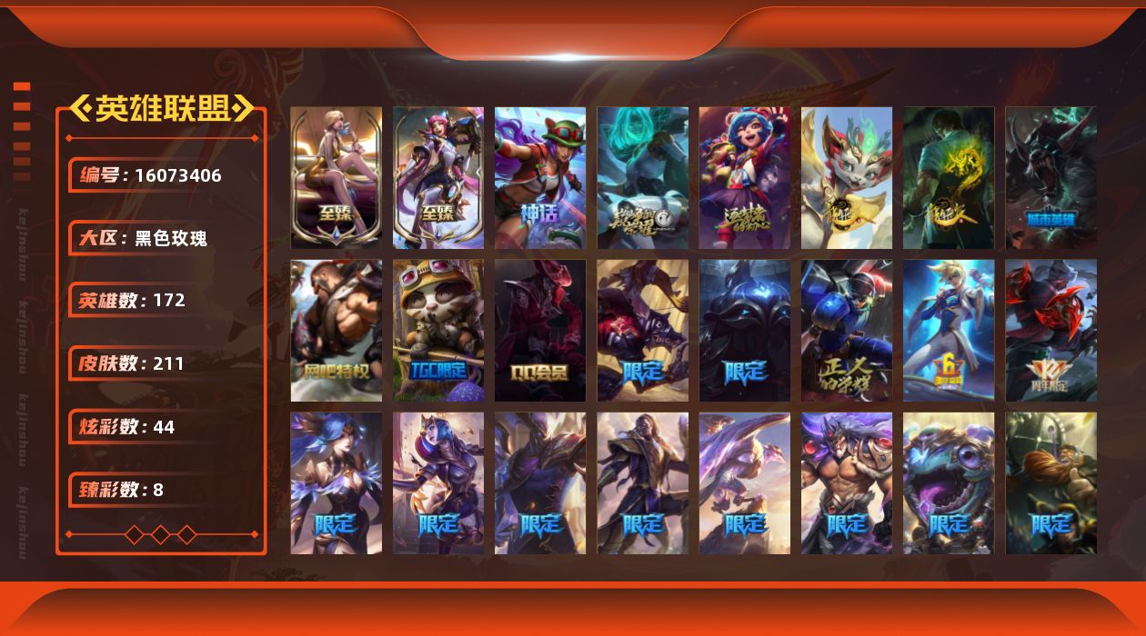 [16073406]【店主推荐捡漏号】未定级段位-172英雄-211皮肤-44炫彩-0终极-6神话-30限定-18传说-49史诗