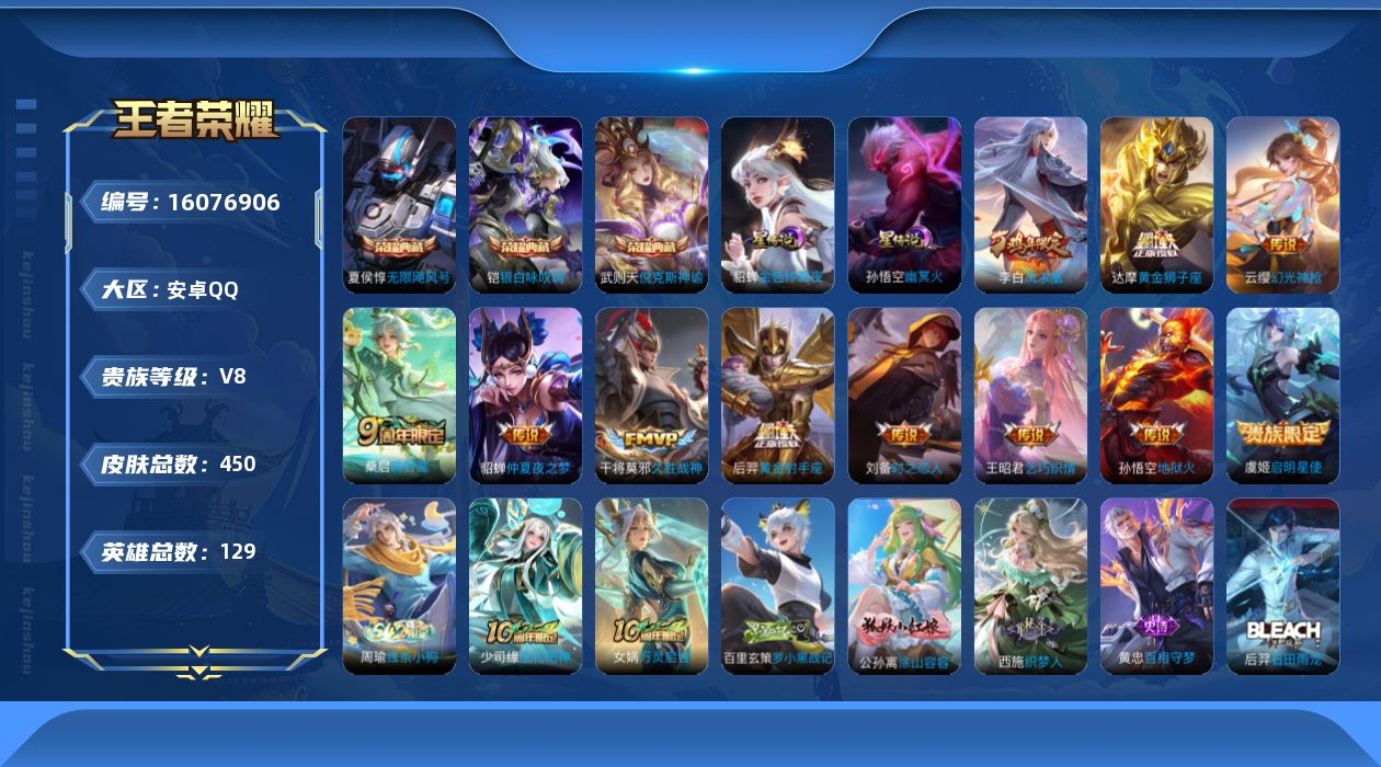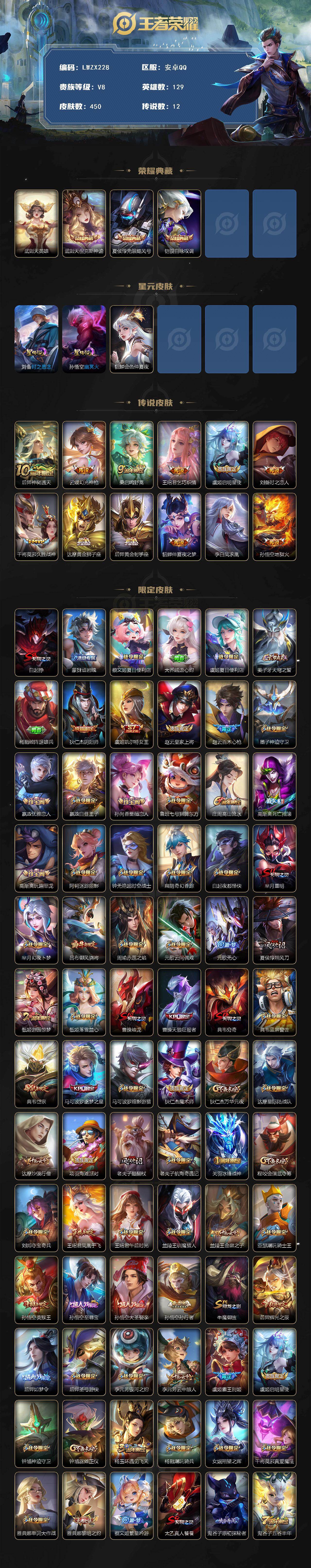 - [16455692]【店主推荐捡漏号!可直接换绑】安卓Q-V7-永恒钻石II段位-128英雄-301皮肤-1典藏皮肤-13传说-78史诗-1星元 【英雄全皮】:孙权全皮,苏烈全皮,猪八戒全皮,空空儿全皮 【荣耀典藏】:花木兰九霄神辉 【传说皮肤】:后羿神树通天,公孙离云诺千山,司空震愿照山河定,云缨幻光神枪,桑启鸣野蒿,曜李逍遥 ,诸葛亮时雨天司,关羽武圣,李信一念神魔,达摩黄金狮子座,梦奇胖达荣荣,杨戬永曜之星,宫本武藏地狱之眼 【限定皮肤】:白起狰,虞姬夏日便利店,李白谪仙醉月,狄仁杰阴阳师,虞姬凯尔特女王,赵云皇家上将,墨子神迹守卫,墨子降魔,嬴政白昼王子,鲁班七号狮舞东方,庄周高山流水,高渐离死亡摇滚,阿轲迷踪丽影,吕布猎兽之王,吕布御风骁将,元歌云间偶戏,夏侯惇朔风刀,曹操烛龙,典韦穷奇,典韦蓝屏警告,马可波罗暗影游猎,狄仁杰魔术师,狄仁杰万华元夜,达摩沙漠行僧,项羽海滩派对,老夫子醍醐杖,老夫子航海奇遇记,关羽武圣,程咬金演武夺筹,刘邦夺宝奇兵,兰陵王金庭之子,花木兰默契交锋,亚瑟潮玩骑士王,孙悟空至尊宝,牛魔御旌,后羿圣弓游侠,李元芳银河之约,李元芳云中旅人,钟馗神迹守卫,钟馗驱傩正仪,杨玉环遇见飞天,杨戬永曜之星,女娲朔望之晖,干将莫邪真爱魔法,雅典娜黎明之约,蔡文姬繁星吟游,太乙真人华丽摇滚,鬼谷子原初探秘者,鬼谷子五谷丰年,诸葛亮时雨天司,铠青龙志,苏烈玄武志,苏烈千军破阵,百里玄策原初追逐者,弈星混沌棋,沈梦溪星空之诺,沈梦溪大漠名商,明世隐疑决卦,裴擒虎李小龙,狂铁御狮,米莱狄御霄,云中君纤云弄巧,盾山御銮,猪八戒西部大镖客,猪八戒猪悟能,上官婉儿梁祝,曜李逍遥 ,艾琳女武神,张良古海寻踪,鬼谷子天穹祈灯,姬小满妄想食味,沈梦溪龙舞盛年,李元芳蔬乡物语 【年限皮肤】:杨戬永曜之星,苏烈玄武志,铠青龙志,诸葛亮时雨天司,吕布御风骁将,司空震愿照山河定 【赛季限定】:虞姬凯尔特女王,白起狰,曹操烛龙,典韦穷奇,狂铁御狮,米莱狄御霄,牛魔御旌,盾山御銮,夏侯惇朔风刀,弈星混沌棋,明世隐疑决卦,老夫子醍醐杖,鬼谷子原初探秘者,狄仁杰万华元夜,程咬金演武夺筹,钟馗驱傩正仪,苏烈千军破阵,达摩沙漠行僧,兰陵王金庭之子,沈梦溪大漠名商,李元芳云中旅人,张良古海寻踪,鬼谷子天穹祈灯,东皇太一噬灭天穹,太乙真人谧流熔炉,钟馗虚灵犬护,甄姬逆浪荇歌,亚瑟荣光之誓,百里玄策原初追逐