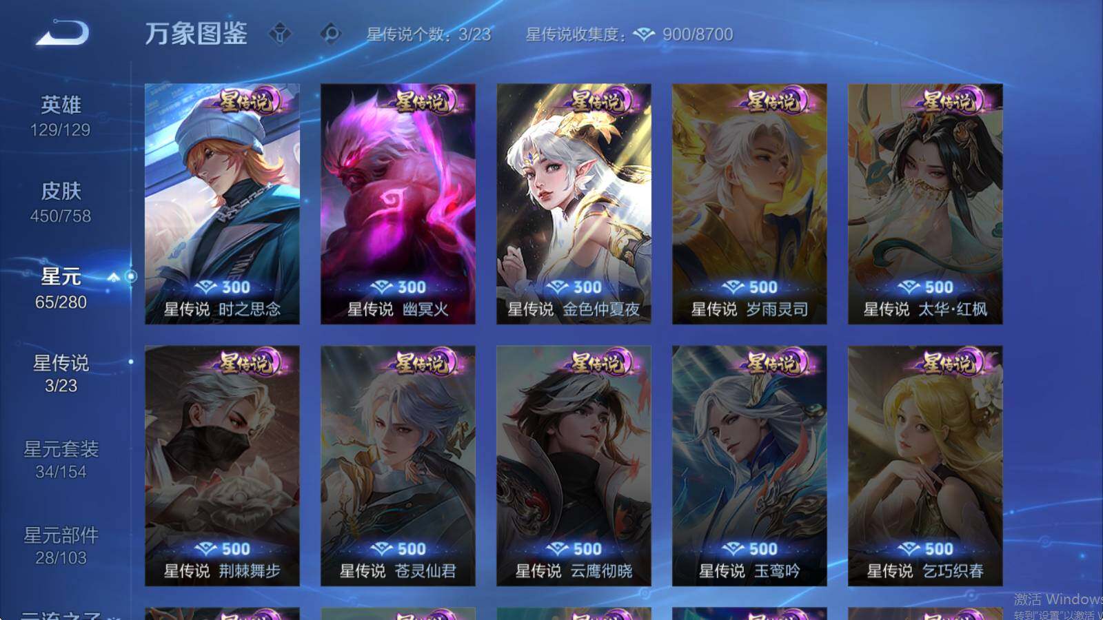 虞姬凯尔特女王,白起狰,太乙真人饕餮,曹操烛龙,芈月重明,典韦穷奇,狂铁御狮,米莱狄御霄,牛魔御旌,盾山御銮,夏侯惇朔风刀,明世隐疑决卦,老夫子醍醐杖,鬼谷子原初探秘者,狄仁杰万华元夜,程咬金演武夺筹,钟馗驱傩正仪,苏烈千军破阵,嬴政白昼王子,女娲朔望之晖,典韦蓝屏警告,钟馗神迹守卫,鲁班七号狮舞东方,沈梦溪星空之诺,李元芳银河之约,刘邦夺宝奇兵,马可波罗暗影游猎,蒙犽狂想玩偶喵,元歌云间偶戏,弈星混沌棋,达摩沙漠行僧,兰陵王金庭之子,沈梦溪大漠名商,李元芳云中旅人,桑启海盐诗旅,裴擒虎擒涛扼浪,鲁班大师探海日志,张良古海寻踪,项羽苍威无极,镜青焰无极