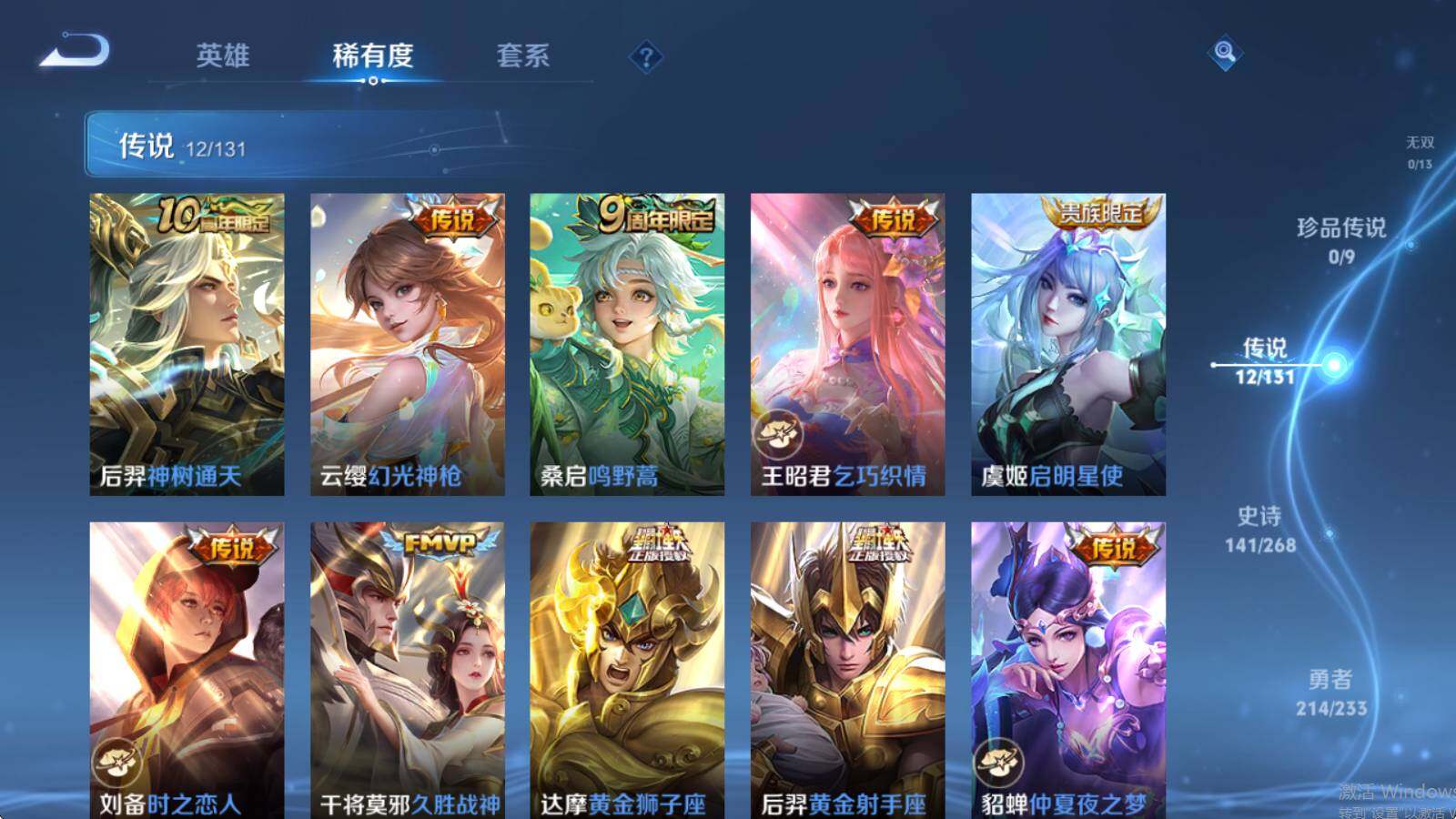 【传说皮肤】:后羿神树通天,云缨幻光神枪,桑启鸣野蒿,王昭君乞巧织情,虞姬启明星使,刘备时之恋人,干将莫邪久胜战神,达摩黄金狮子座,后羿黄金射手座,貂蝉仲夏夜之梦,李白凤求凰,孙悟空地狱火
