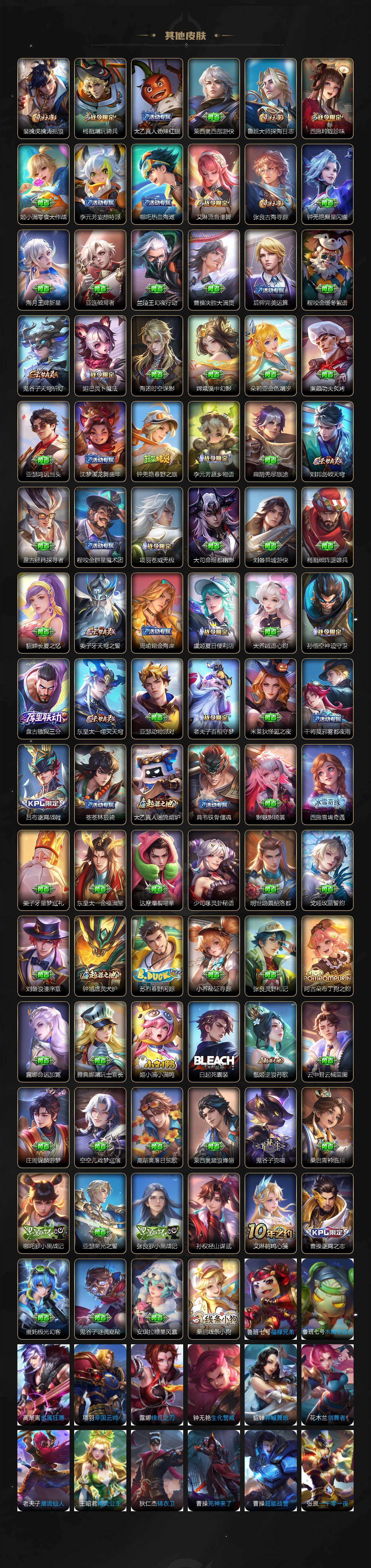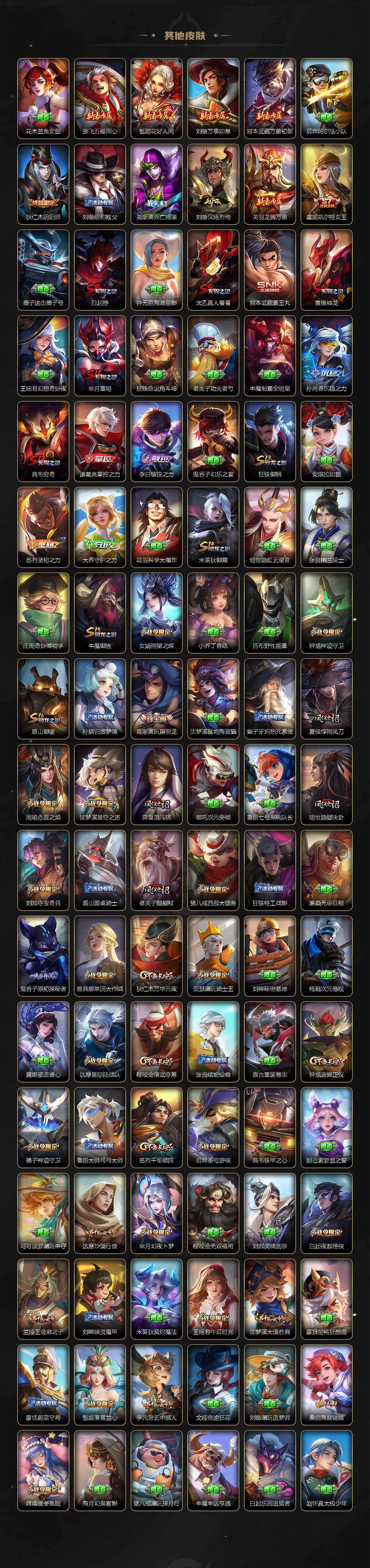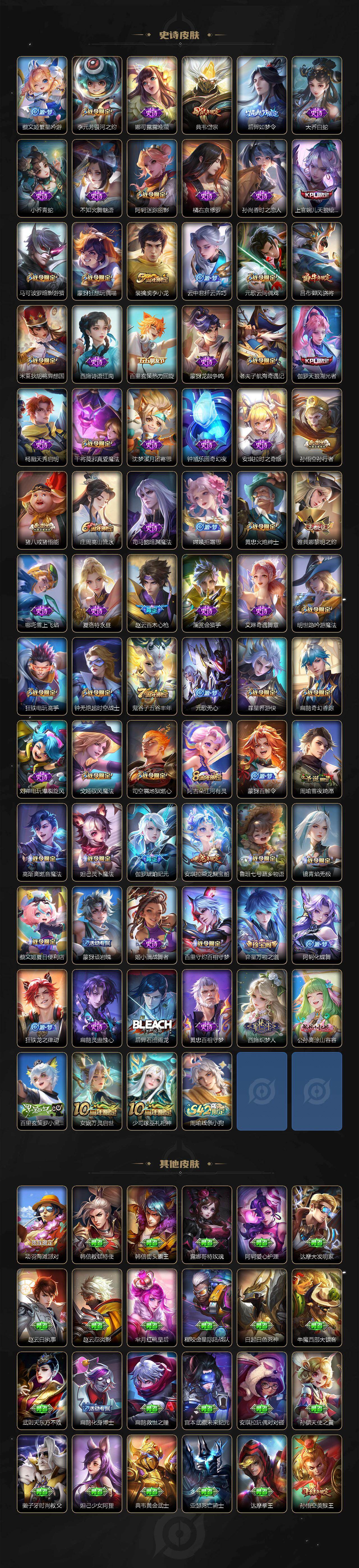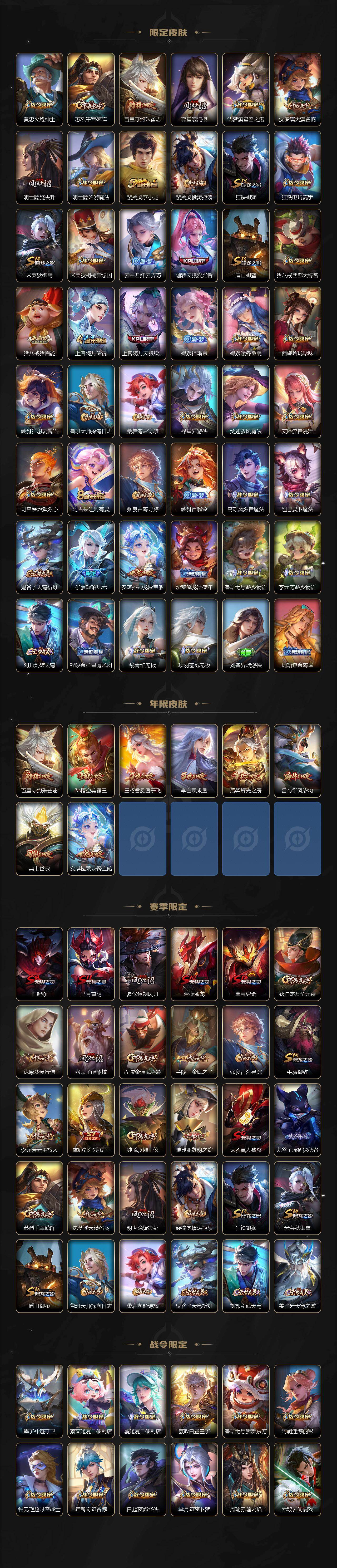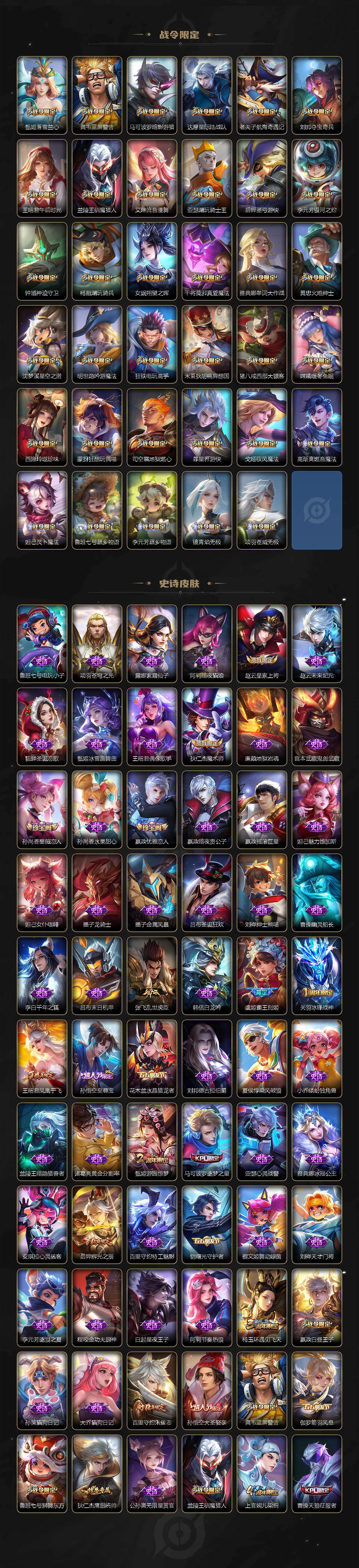【限定皮肤】:白起狰,蒙犽顽岩魄,蔡文姬夏日便利店,大乔绒语心约,虞姬夏日便利店,姜子牙天穹之誓,杨戬破阵退雄兵,狄仁杰阴阳师,虞姬凯尔特女王,赵云皇家上将,赵云百木心枪,墨子神迹守卫,嬴政优雅恋人,嬴政白昼王子,孙尚香蔷薇恋人,鲁班七号狮舞东方,庄周高山流水,高渐离死亡摇滚,高渐离玩趣恶龙,阿轲迷踪丽影,钟无艳超时空战士,扁鹊奇幻香踪,白起夜都怪侠,芈月重明,芈月幻夜卜梦,吕布御风骁将,周瑜赤莲之焰,元歌云间偶戏,元歌无心,夏侯惇朔风刀,甄姬游园惊梦,甄姬落雪兰心,曹操烛龙,曹操天狼征服者,典韦穷奇,典韦蓝屏警告,典韦岱宗,马可波罗逐梦之星,马可波罗暗影游猎,狄仁杰魔术师,狄仁杰万华元夜,达摩星际陆战队,达摩沙漠行僧,项羽海滩派对,老夫子醍醐杖,老夫子航海奇遇记,关羽冰锋战神,程咬金演武夺筹,刘邦夺宝奇兵,王昭君凤凰于飞,王昭君午后时光,兰陵王驯魔猎人,兰陵王金庭之子,亚瑟潮玩骑士王,孙悟空美猴王,孙悟空至尊宝,孙悟空大圣娶亲,孙悟空孙行者,牛魔御旌,后羿辉光之辰,后羿如梦令,后羿圣弓游侠,李元芳银河之约,李元芳云中旅人,虞姬霸王别姬,虞姬启明星使,钟馗神迹守卫,钟馗驱傩正仪,杨玉环遇见飞天,杨戬潮玩骑兵,女娲朔望之晖,干将莫邪真爱魔法,雅典娜单词大作战,雅典娜黎明之约,蔡文姬繁星吟游,太乙真人饕餮,鬼谷子原初探秘者,鬼谷子五谷丰年,黄忠火炮绅士,苏烈千军破阵,百里守约朱雀志,弈星混沌棋,沈梦溪星空之诺,沈梦溪大漠名商,明世隐疑决卦,明世隐吟游魔法,裴擒虎李小龙,裴擒虎擒涛扼浪,狂铁御狮,狂铁电玩高手,米莱狄御霄,米莱狄胡桃异想国,云中君纤云弄巧,伽罗天狼溯光者,盾山御銮,猪八戒西部大镖客,猪八戒猪悟能,上官婉儿梁祝,上官婉儿天狼绘梦者,