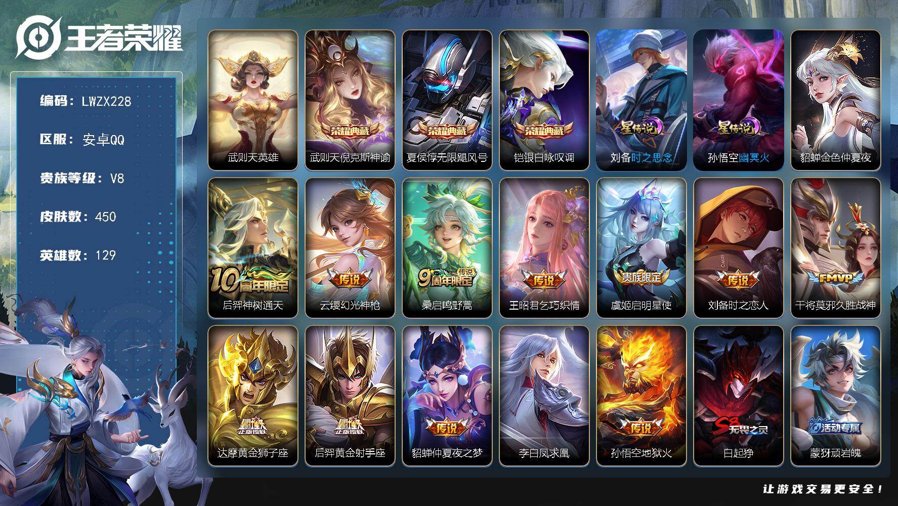 [16076906]可二次【特价出售/店主推荐】安卓Q-V8-秩序白银III段位-129英雄-450皮肤-3典藏皮肤-1典藏英雄-12传说-140史诗-3星元 【英雄全皮】:达摩全皮,刘邦全皮,孙权全皮,钟馗全皮,鬼谷子全皮,狂铁全皮,猪八戒全皮,蒙犽全皮,戈娅全皮,空空儿全皮,影全皮 【荣耀典藏】:武则天英雄,武则天倪克斯神谕,夏侯惇无限飓风号,铠银白咏叹调 【传说皮肤】:后羿神树通天,云缨幻光神枪,桑启鸣野蒿,王昭君乞巧织情,虞姬启明星使,刘备时之恋人,干将莫邪久胜战神,达摩黄金狮子座,后羿黄金射手座,貂蝉仲夏夜之梦,李白凤求凰,孙悟空地狱火 【限定皮肤】:白起狰,蒙犽顽岩魄,蔡文姬夏日便利店,大乔绒语心约,虞姬夏日便利店,姜子牙天穹之誓,杨戬破阵退雄兵,狄仁杰阴阳师,虞姬凯尔特女王,赵云皇家上将,赵云百木心枪,墨子神迹守卫,嬴政优雅恋人,嬴政白昼王子,孙尚香蔷薇恋人,鲁班七号狮舞东方,庄周高山流水,高渐离死亡摇滚,高渐离玩趣恶龙,阿轲迷踪丽影,钟无艳超时空战士,扁鹊奇幻香踪,白起夜都怪侠,芈月重明,芈月幻夜卜梦,吕布御风骁将,周瑜赤莲之焰,元歌云间偶戏,元歌无心,夏侯惇朔风刀,甄姬游园惊梦,甄姬落雪兰心,曹操烛龙,曹操天狼征服者,典韦穷奇,典韦蓝屏警告,典韦岱宗,马可波罗逐梦之星,马可波罗暗影游猎,狄仁杰魔术师,狄仁杰万华元夜,达摩星际陆战队,达摩沙漠行僧,项羽海滩派对,老夫子醍醐杖,老夫子航海奇遇记,关羽冰锋战神,程咬金演武夺筹,刘邦夺宝奇兵,王昭君凤凰于飞,王昭君午后时光,兰陵王驯魔猎人,兰陵王金庭之子,亚瑟潮玩骑士王,孙悟空美猴王,孙悟空至尊宝,孙悟空大圣娶亲,孙悟空孙行者,牛魔御旌,后羿辉光之辰,后羿如梦令,后羿圣弓游侠,李元芳银河之约,李元芳云中旅人,虞姬霸王别姬,虞姬启明星使,钟馗神迹守卫,钟馗驱傩正仪,杨玉环遇见飞天,杨戬潮玩骑兵,女娲朔望之晖,干将莫邪真爱魔法,雅典娜单词大作战,雅典娜黎明之约,蔡文姬繁星吟游,太乙真人饕餮,鬼谷子原初探秘者,鬼谷子五谷丰年,黄忠火炮绅士,苏烈千军破阵,百里守约朱雀志,弈星混沌棋,沈梦溪星空之诺,沈梦溪大漠名商,明世隐疑决卦,明世隐吟游魔法,裴擒虎李小龙,裴擒虎擒涛扼浪,狂铁御狮,狂铁电玩高手,米莱狄御霄,米莱狄胡桃异想国,云中君纤云弄巧,伽罗天狼溯光者,盾山御銮,猪八戒西部大镖客,猪八戒猪悟能,上官婉儿梁祝,上官婉儿天狼绘梦者,