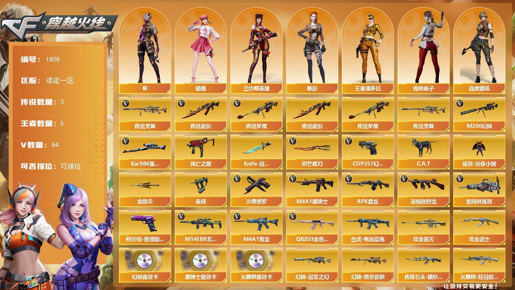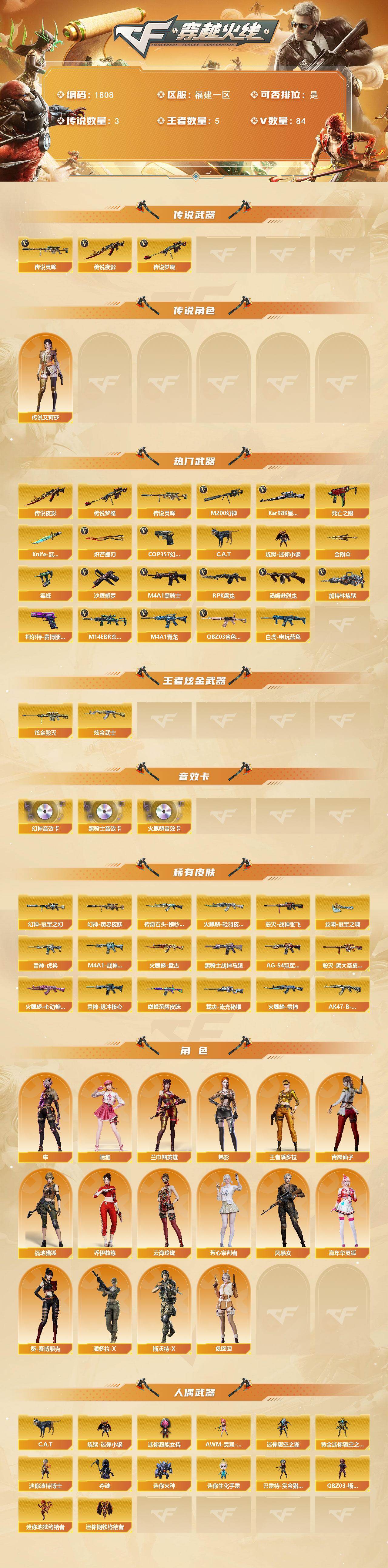 [16077620]福建一区-84V-5王者-2炫金 【传说武器】:传说夜影,传说梦魇,传说灵眸 【传说角色】:传说艾莉莎 【热门武器】:传说梦魇,传说夜影,传说灵眸,QBZ03-金色蔷薇,M14EBR-玄武,M4A1-青龙,M200-幻神,死亡之眼,白虎-电玩蓝兔,Kar98K-星神*2,C.A.T,炼狱-迷你小钢,毒蜂,M4A1-黑骑士*2,汤姆逊-烈龙*5,RPK-盘龙*5,加特林-炼狱,COP 357-幻灵*2,沙鹰-修罗,柯尔特-赛博朋克*2,Knife-冠军之刃,炽芒蝶刃,金刚伞 【王者炫金武器】:炫金武士,炫金毁灭 【音效卡】:M200-幻神音效卡,AK47-火麒麟音效卡,M4A1-黑骑士音效卡 【皮肤】:M200-幻神-黄忠皮肤,幻神-冠军之幻,QBZ03-巅峰荣耀皮肤,裁决-流光秘银,雷神-虎将,M4A1-战神赵云,雷神-脉冲核心,火麒麟-雷神,火麒麟-轻羽皮肤,传奇石头-横秒之巅,火麒麟-盘古,火麒麟-心动糖果,毁灭-战神张飞,毁灭-黑大圣皮肤,黑骑士-战神马超,黑骑士-AG-S4冠军典藏,AK47-B-常胜将军-刘备,龙啸-冠军之啸 【角色】:魅影,兰-巾帼英雄,晴雅,隼,战地猎狐,王者潘多拉,乔伊教练,云海玲珑,芳心审判者,风暴女,嘉年华灵狐,葵-赛博朋克,潘多拉-X,青霞仙子,斯沃特-X,兔囡囡 【人偶武器】:炼狱-迷你小钢,迷你钢铁终结者,迷你地狱终结者,AWM-灵狐-15周年嘉年华,C.A.T,迷你裂空之翼,黄金迷你裂空之翼,迷你波特博士*4,夺魂,迷你火种*2,迷你生化手雷,巴雷特-赏金猎人,迷你超能女侍,QBZ03-斯沃特 【暴走生化】:毒蜂,死亡之眼 【挑战大师】:冰龙粉碎者-白马银枪*2,激光毁灭者III-白马银枪,VEPR-12-金魔,机甲撕裂者III,试炼破坏者III,KAC-圣炎切割者III,阐释者III 【英雄级武器】:AK47-火麒麟*2,M4A1-雷神,M4A1-黑骑士*2,AK47-黑武士,AK12-天启,AN94-超新星,M4A1-青龙,M14EBR-玄武,无影-神兵利器,黑武士-锦绣游龙,QBZ03-金色蔷薇,烈火-动感闪耀,AK-47-猩红传说*3,AK47-B-战神*2,白虎-电玩蓝兔,白虎之魄-觉醒版,王者芳薇-觉醒版,Barrett-毁灭,M200-幻神,Kar98K-星神*2,Barrett-金色蔷薇,王者之光-觉醒版