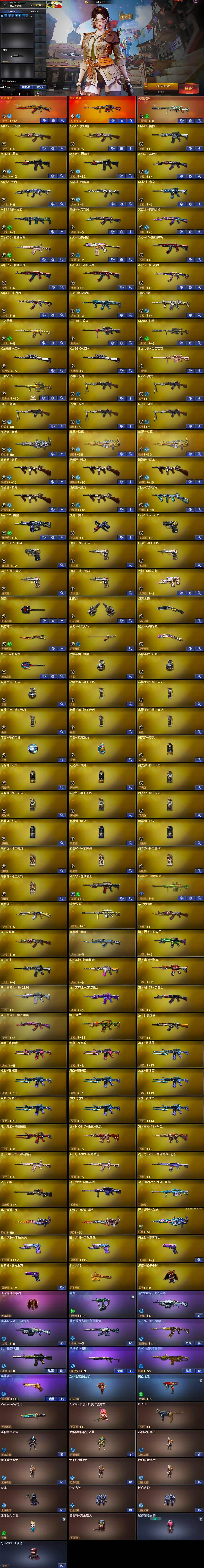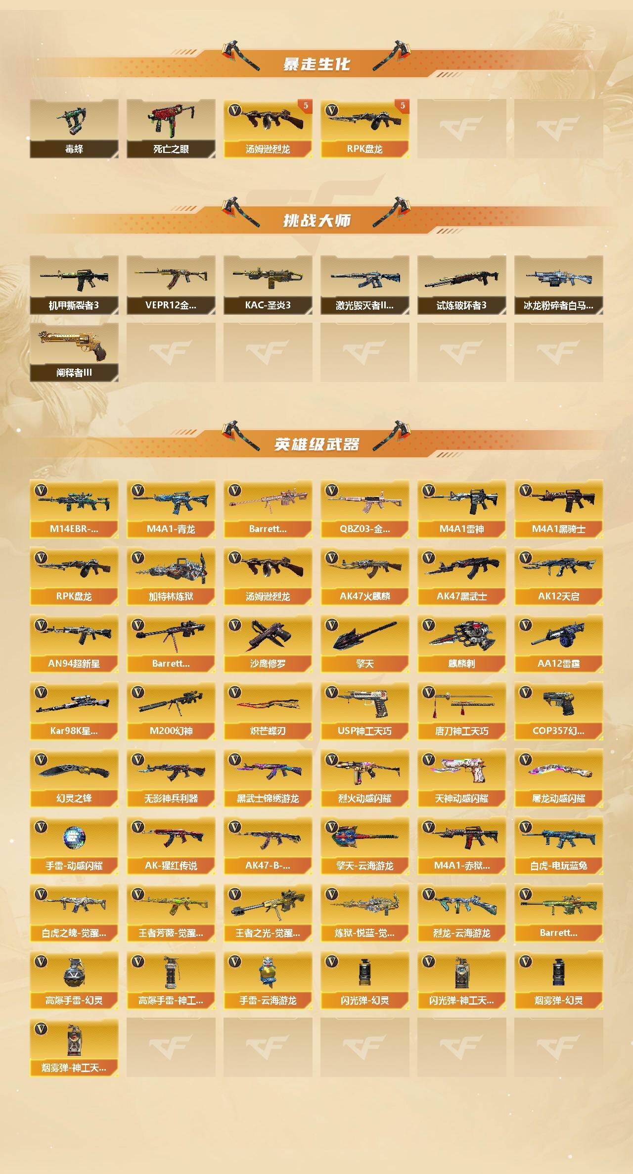 【英雄级武器】:AK47-火麒麟*2,M4A1-雷神,M4A1-黑骑士*2,AK47-黑武士,AK12-天启,AN94-超新星,M4A1-青龙,M14EBR-玄武,无影-神兵利器,黑武士-锦绣游龙,QBZ03-金色蔷薇,烈火-动感闪耀,AK-47-猩红传说*3,AK47-B-战神*2,白虎-电玩蓝兔,白虎之魄-觉醒版,王者芳薇-觉醒版,Barrett-毁灭,M200-幻神,Kar98K-星神*2,Barrett-金色蔷薇,王者之光-觉醒版