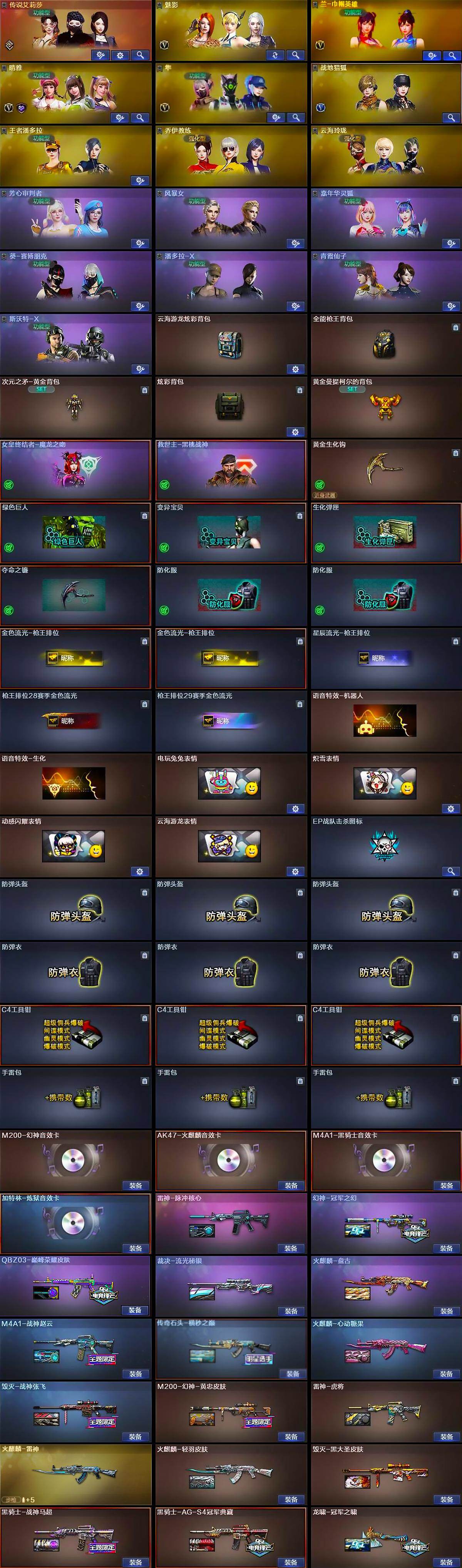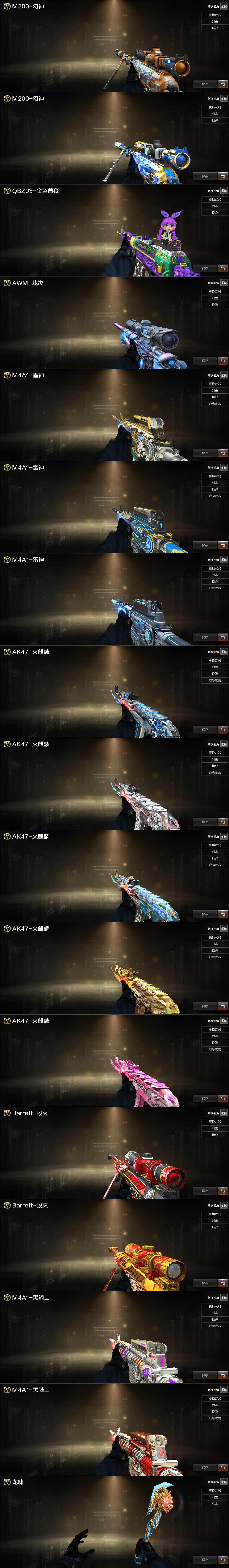 【皮肤】:M200-幻神-黄忠皮肤,幻神-冠军之幻,QBZ03-巅峰荣耀皮肤,裁决-流光秘银,雷神-虎将,M4A1-战神赵云,雷神-脉冲核心,火麒麟-雷神,火麒麟-轻羽皮肤,传奇石头-横秒之巅,火麒麟-盘古,火麒麟-心动糖果,毁灭-战神张飞,毁灭-黑大圣皮肤,黑骑士-战神马超,黑骑士-AG-S4冠军典藏,AK47-B-常胜将军-刘备,龙啸-冠军之啸
